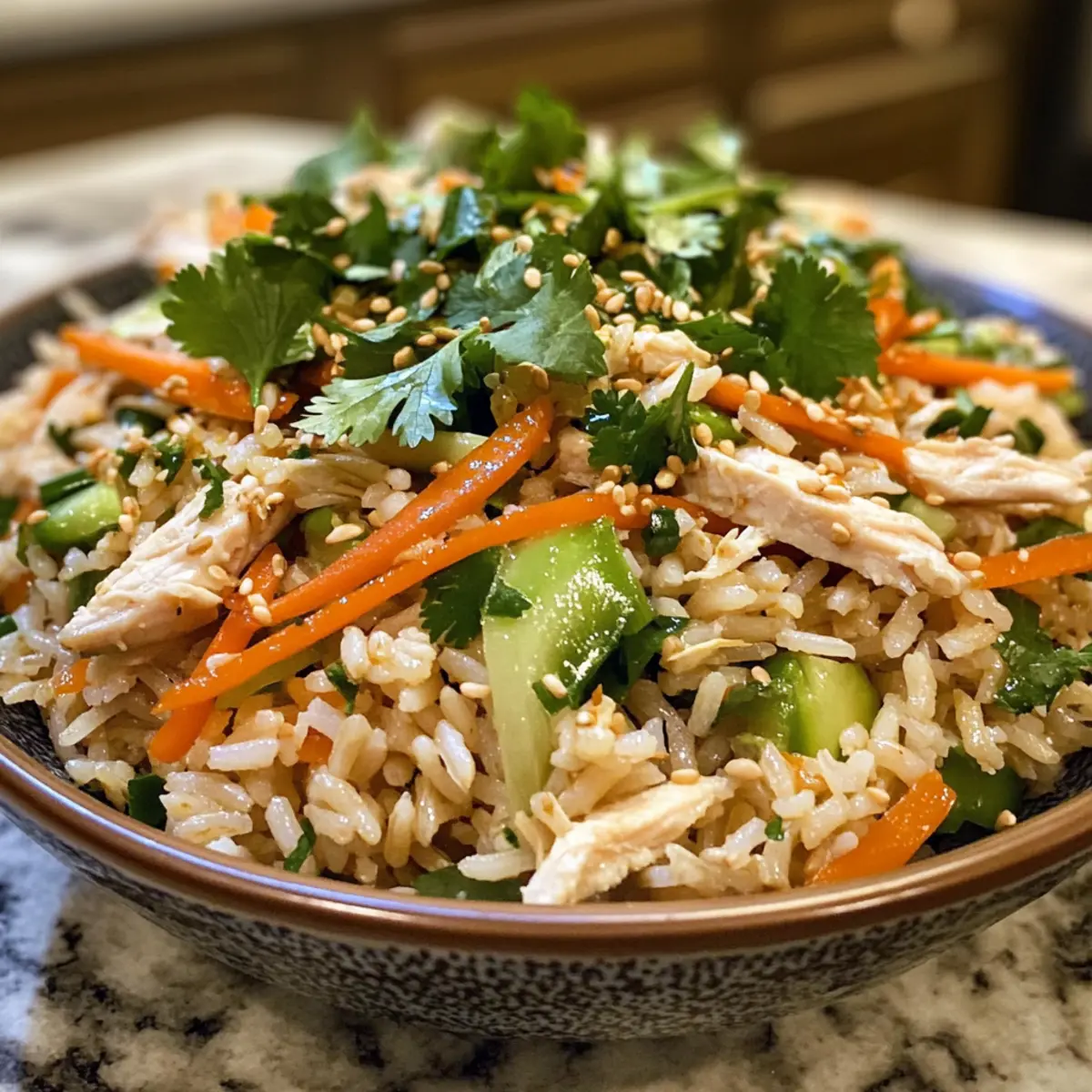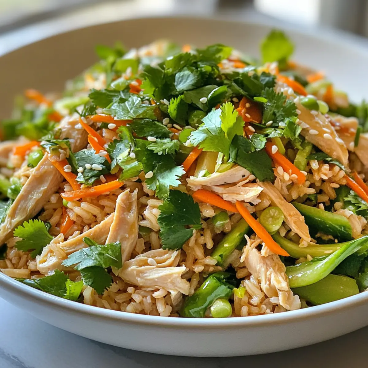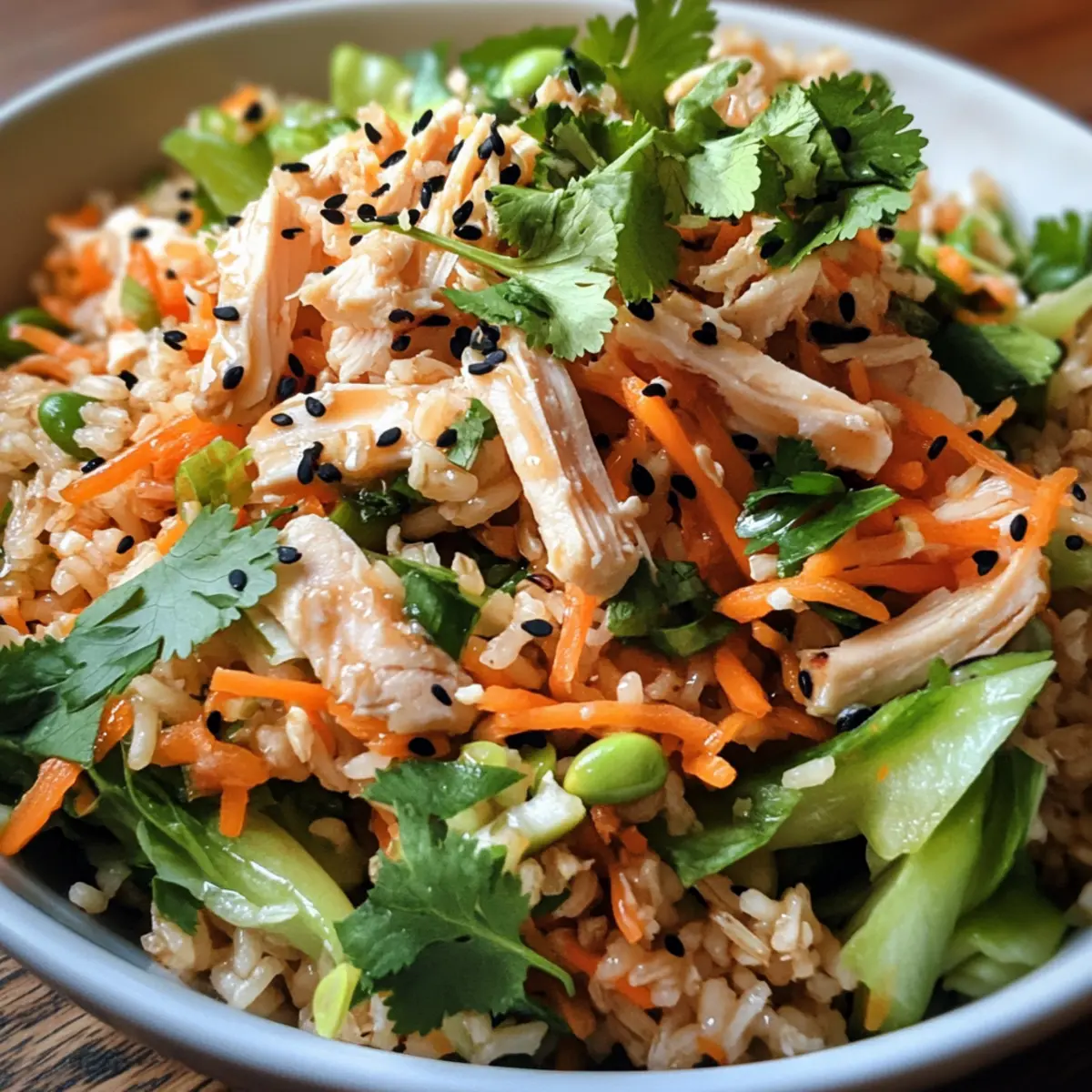 These Asian-Style Brown Rice Salad ingredients are perfect for meal prep enthusiasts! To save time, you can prepare the salad mixture (without the dressing) up to 3 days in advance. Simply cook the brown rice and let it cool completely before mixing it with the shredded chicken, vegetables, and herbs. Store this mixture in an airtight container in the refrigerator to maintain its crispness. The dressing, made with fresh ingredients like garlic and orange juice, can be whisked together and refrigerated for up to 24 hours. When you’re ready to serve, just drizzle the dressing over the salad, toss gently, and add sesame seeds for a delicious, fresh meal with minimal effort!