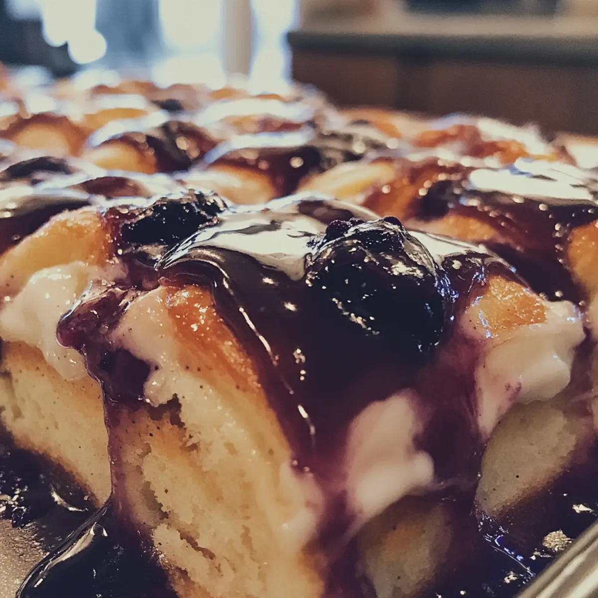 - Drizzle cream cheese frosting over baked rolls. Optional: add leftover blueberry compote and sprinkle streusel topping. Serve warm.
