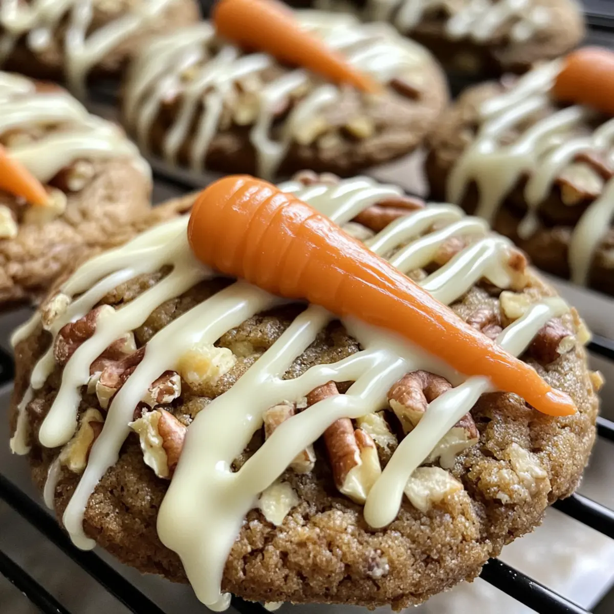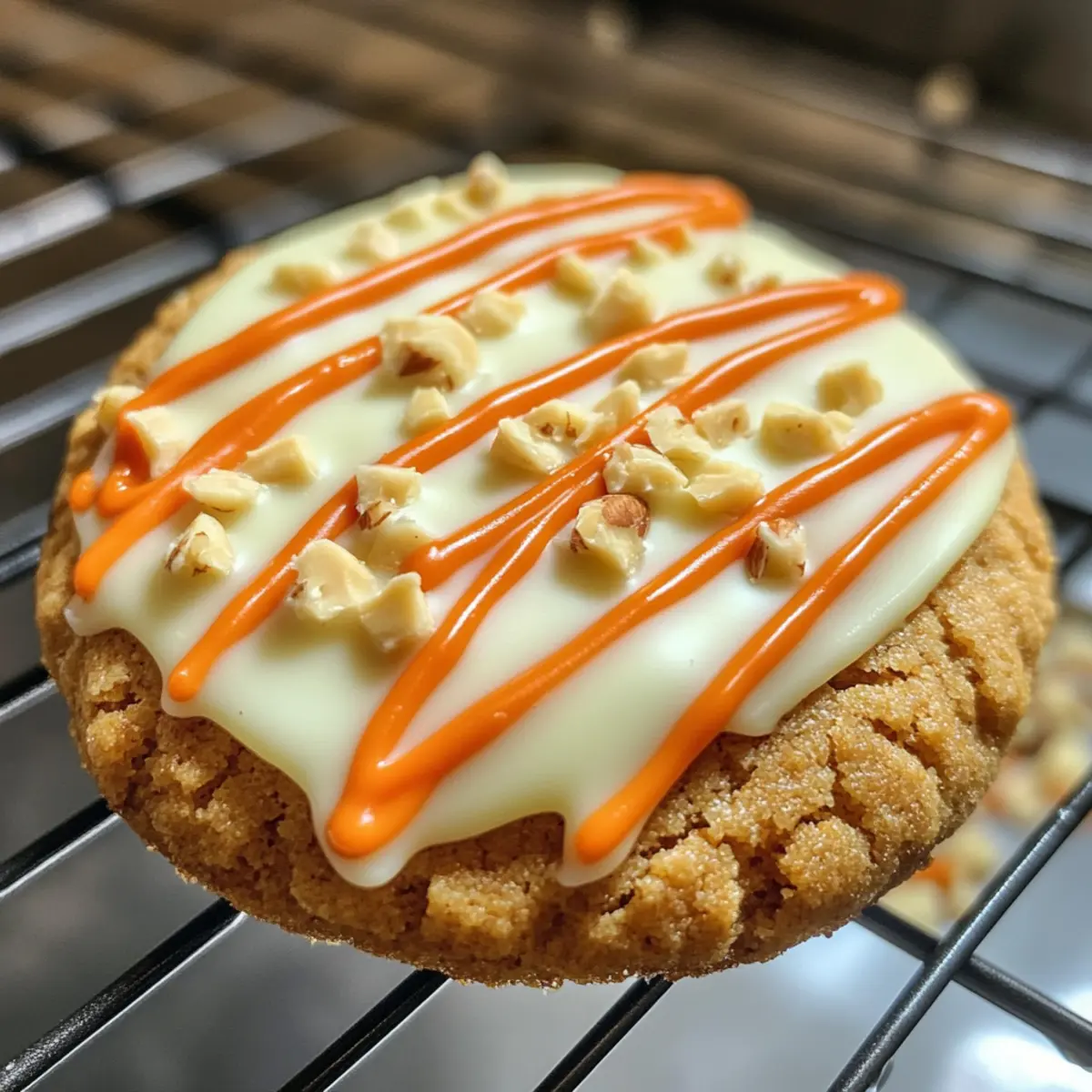 Once baked, remove the trays from the oven and let the cookies cool for 10 minutes before transferring them to a wire rack. After they have completely cooled, drizzle with melted white chocolate and decorate with fondant carrots for an adorable finishing touch, enhancing the sweetness of your Carrot Cake Cookies.