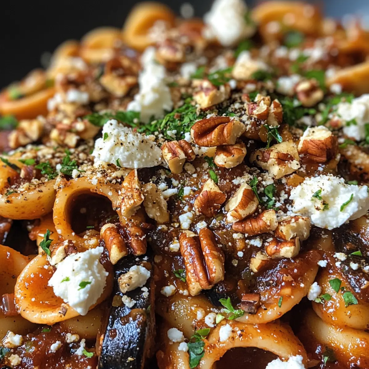 - Plate the pasta, topping with goat cheese, pecans, and additional parsley before serving.