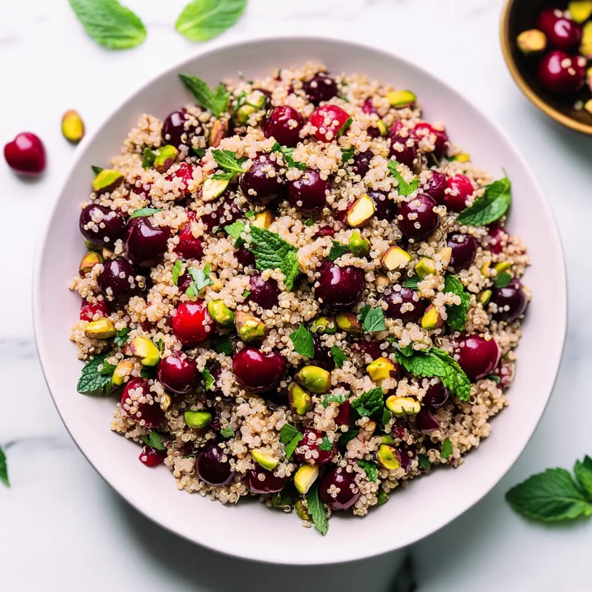 - In a large mixing bowl, combine cooled quinoa, cherries, pistachios, red onion, and mint. Drizzle with apple cider vinegar and lemon juice, season with salt and pepper, and toss gently.