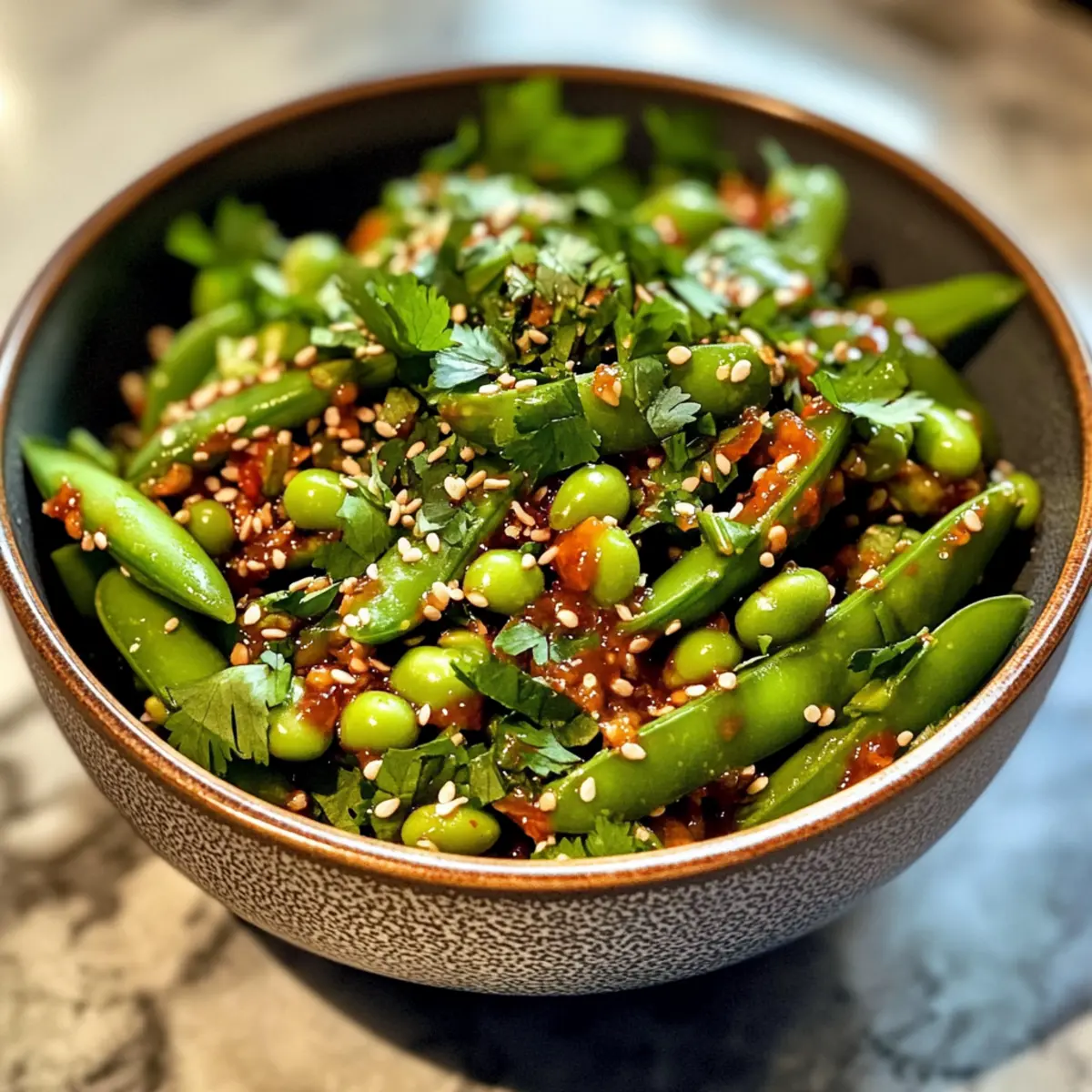 Bright, Fresh Ingredients: The vibrant colors of crisp snap peas and tender edamame create a visually stunning dish that’s as appealing as it is tasty.