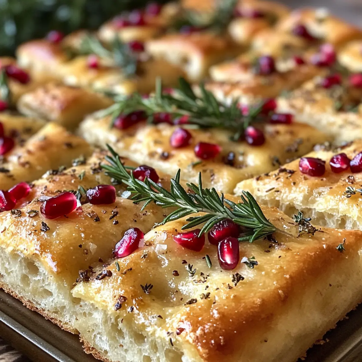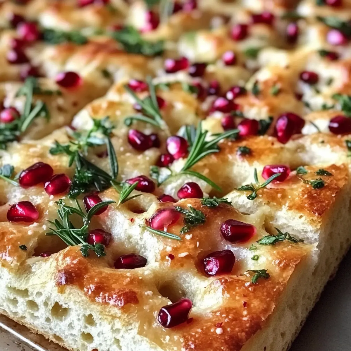 Once the dough has risen, use your fingertips to create dimples across the surface, giving it that signature focaccia look. Sprinkle a generous handful of pomegranate seeds, fresh rosemary, and finely chopped parsley on top, then drizzle with olive oil for richness. The vibrant toppings will elevate the festive spirit of your Christmas focaccia.