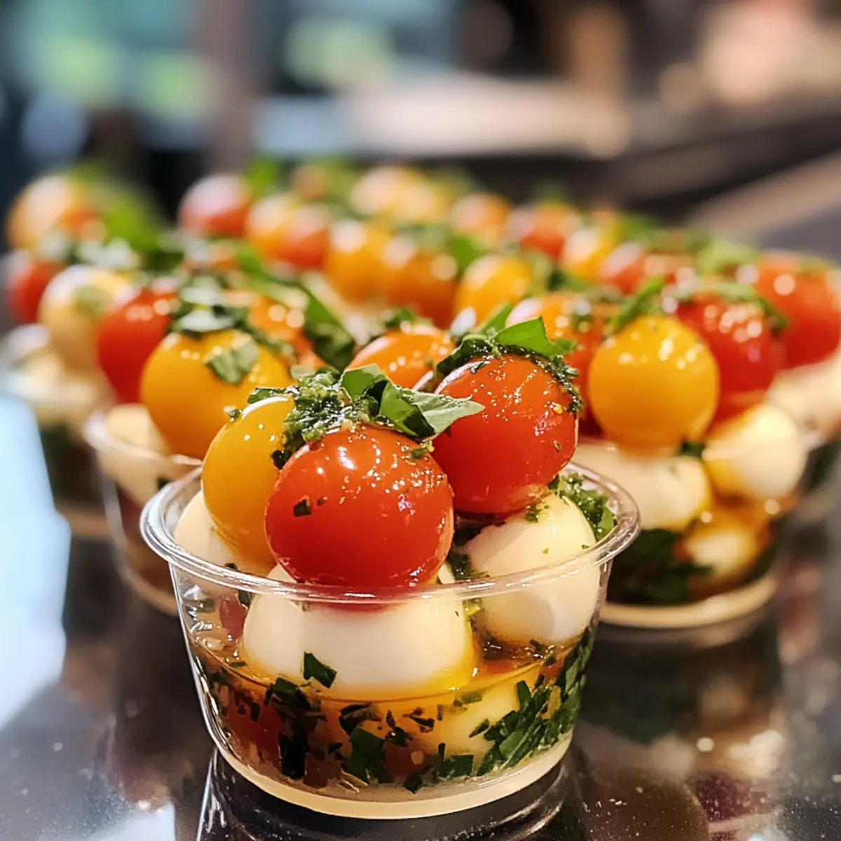 - Grab small cups or shot glasses and layer halved cherry tomatoes at the bottom. Follow with mozzarella halves and a sprinkle of chopped basil.