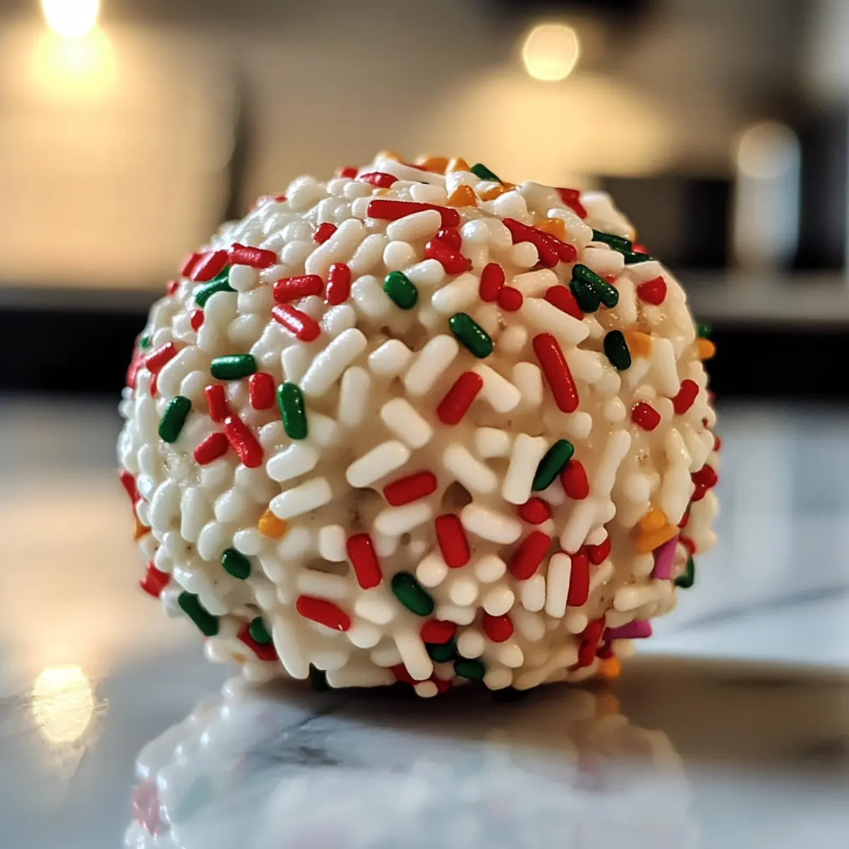 Now, melt 8 ounces of white chocolate using a microwave-safe bowl. Heat in 30-second increments, stirring in between until smooth and fluid, which should take about 1-2 minutes total. Dip each rice crispy ball into the melted white chocolate, allowing any excess to drip off, and then immediately sprinkle with your chosen holiday decorations.