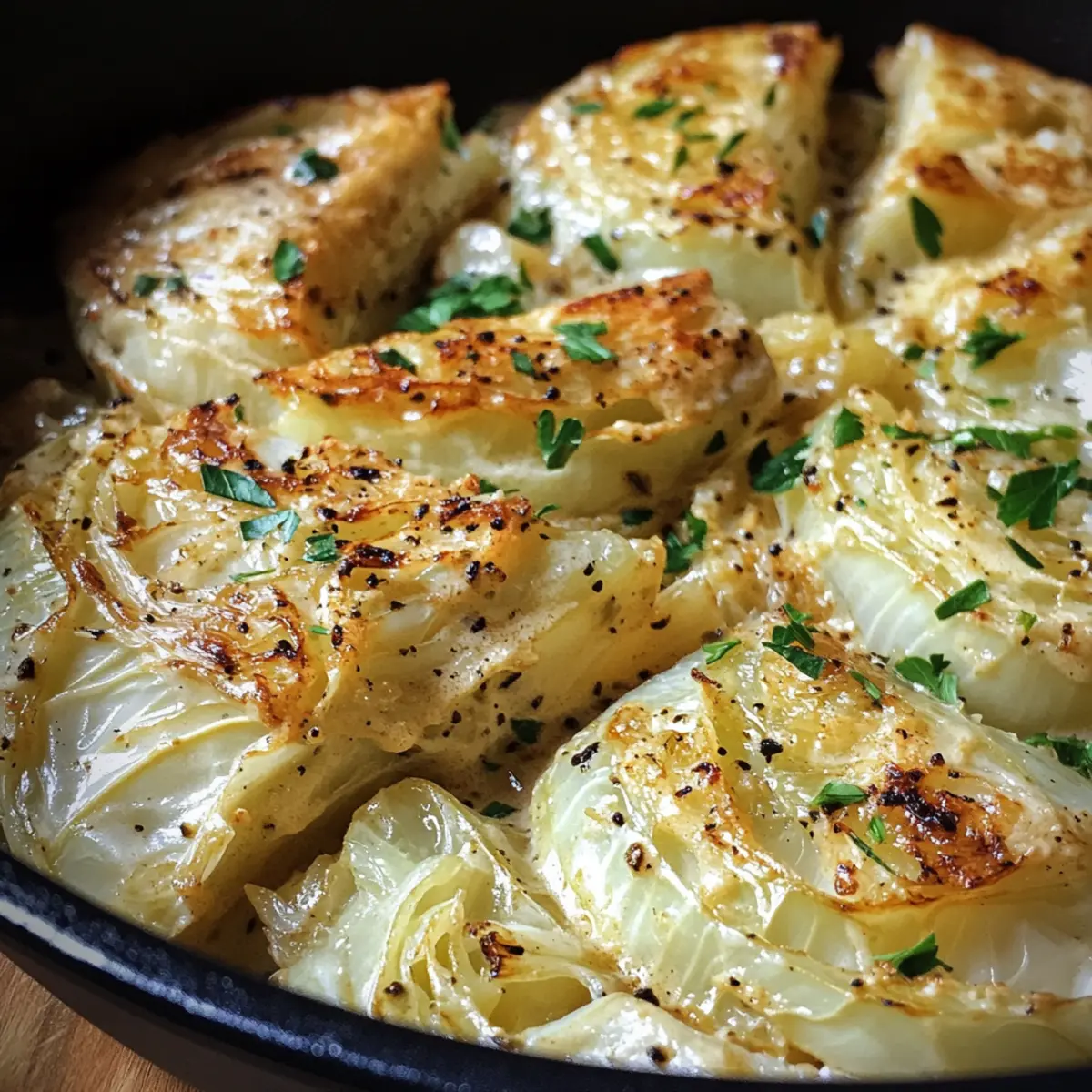Mix in ½ cup of freshly grated Parmesan cheese and 1 tablespoon of chopped parsley, allowing the sauce to simmer until its texture becomes smooth and creamy. The cheese will melt into the sauce, creating a luscious coating. Return the seared cabbage to the skillet, spooning the sauce generously over the pieces.
