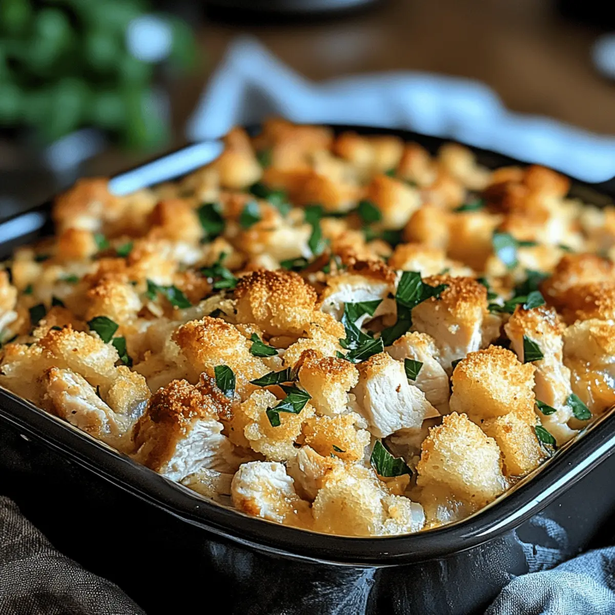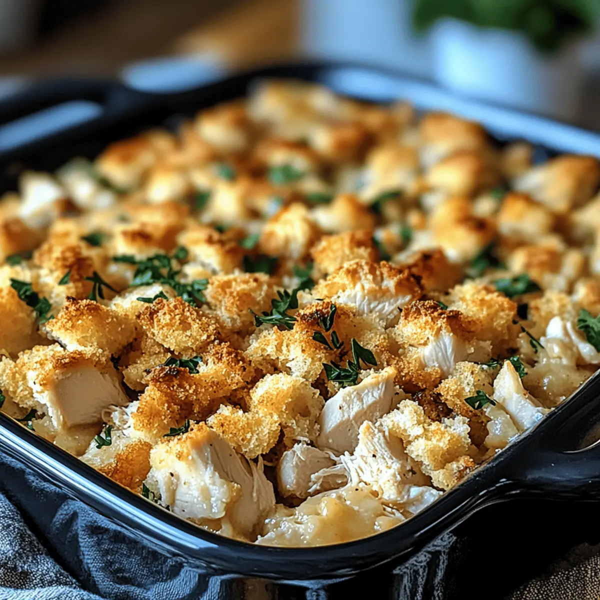 Dolly’s Chicken and Stuffing Casserole is a fantastic option for meal prep that truly saves time during busy weeknights! You can prepare the casserole up to 24 hours in advance by mixing the creamy filling and layering it with the stuffing, then refrigerating it until you’re ready to cook. To maintain quality, make sure to cover it tightly with plastic wrap or aluminum foil to prevent drying out. When ready to serve, simply remove it from the fridge, pour the broth over the stuffing, and bake as directed, adding a few extra minutes to the baking time if it’s chilled. Enjoy the comfort of a homemade meal with minimal last-minute effort!