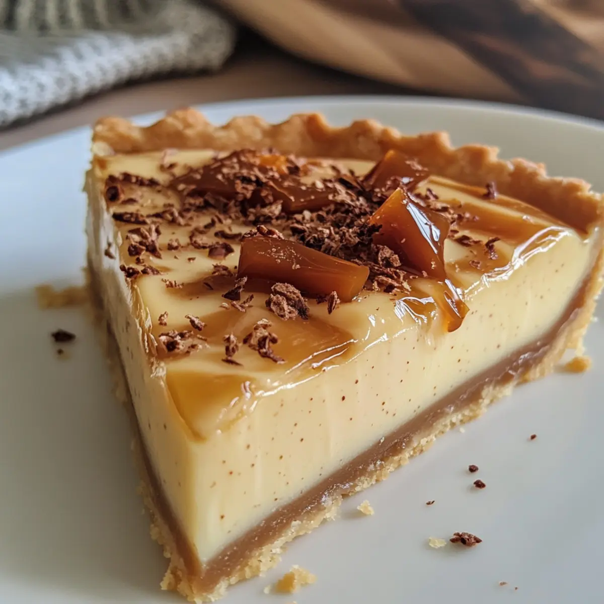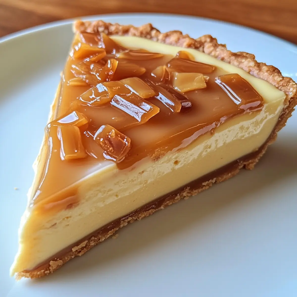 - Once the Eggnog Crème Tart is set, remove it from the refrigerator. Top with caramel shards just before serving for a delightful crunch.