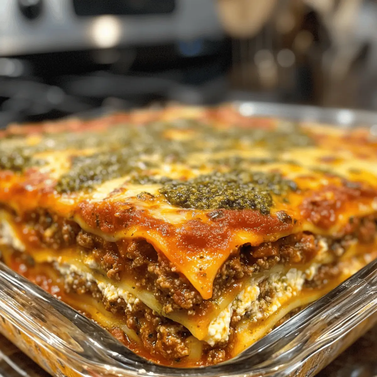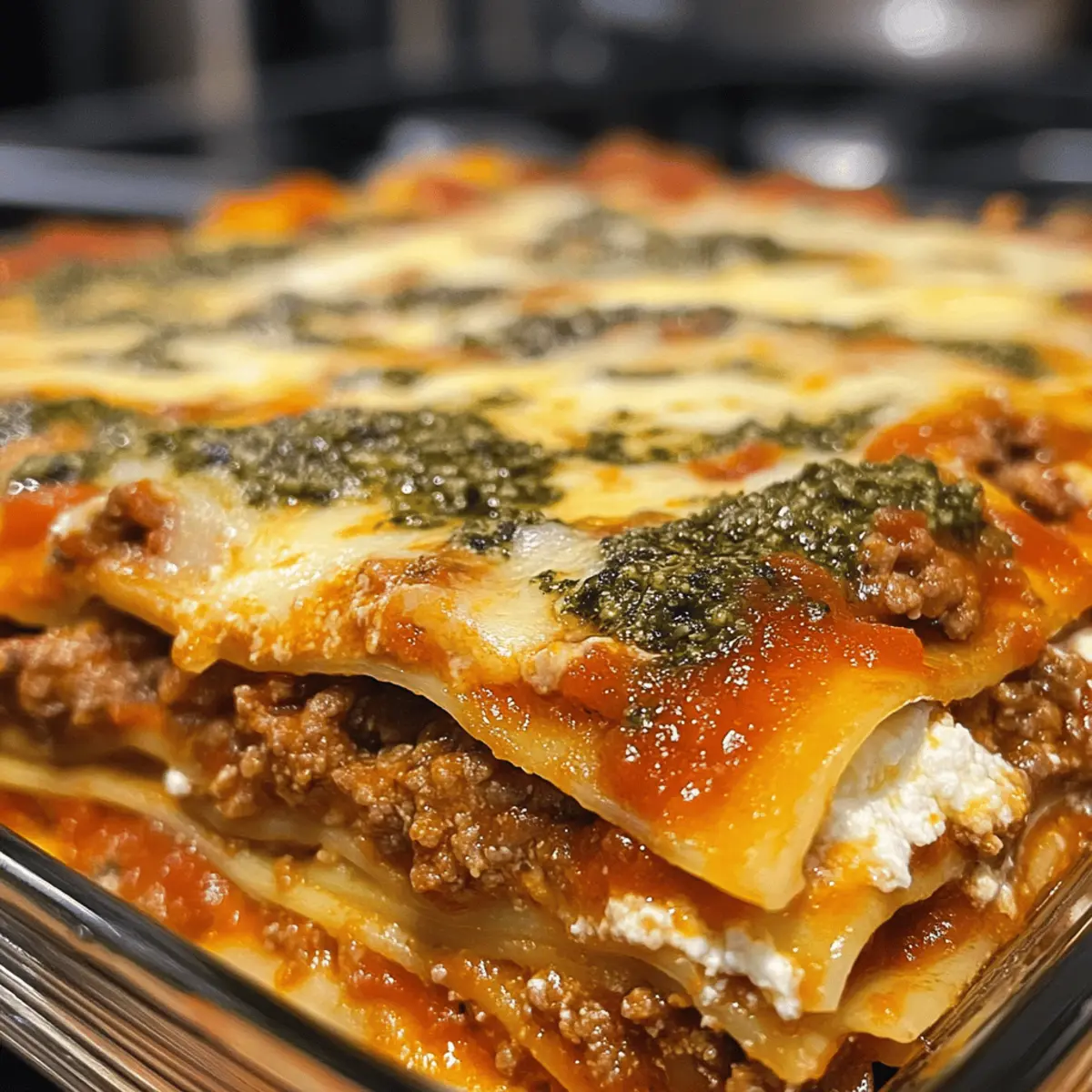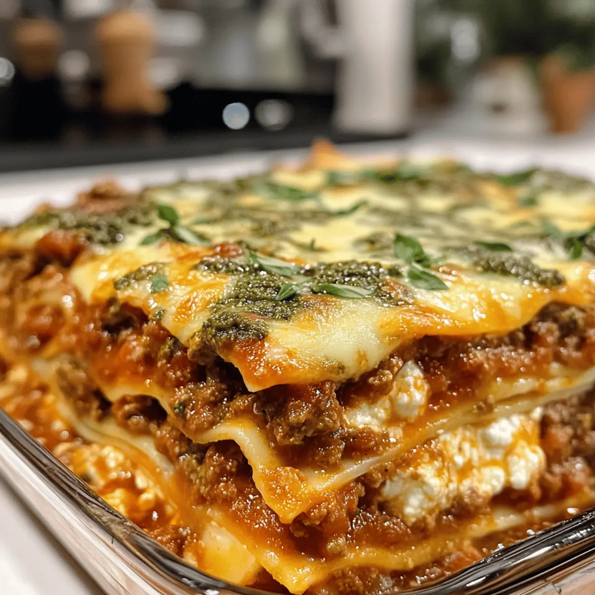 - Preheat your oven to 375°F (190°C) and prepare a large baking dish by spooning a little bolognese sauce onto the bottom. Start layering with bolognese sauce, followed by lasagna noodles, dollops of pesto ricotta, and repeat until all ingredients are used. Finish with a generous layer of bolognese on top.