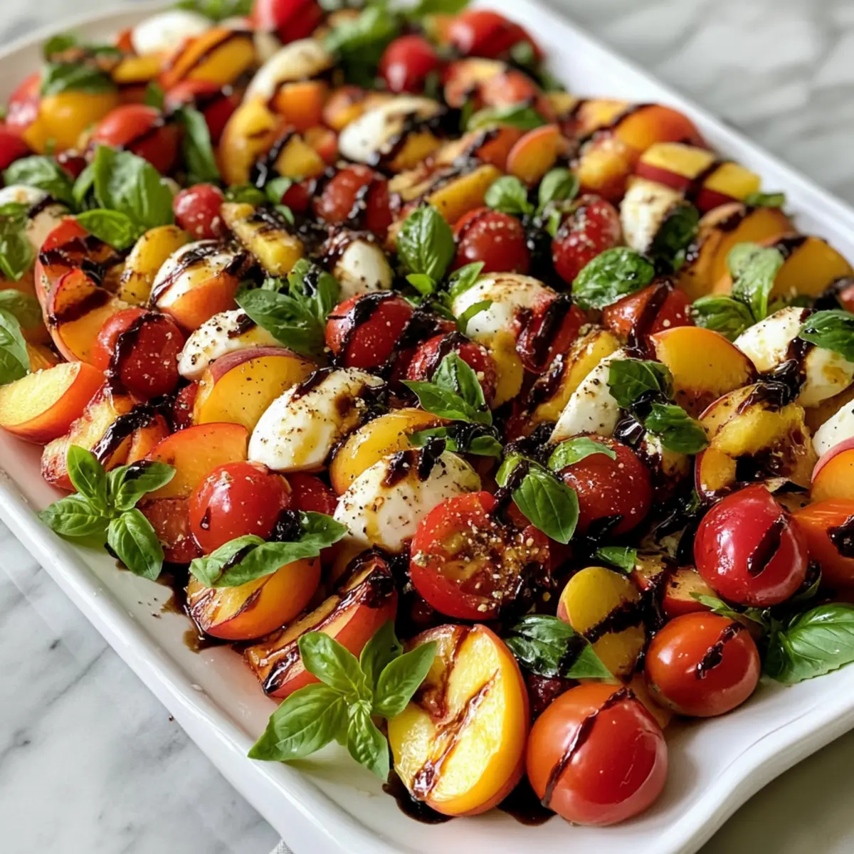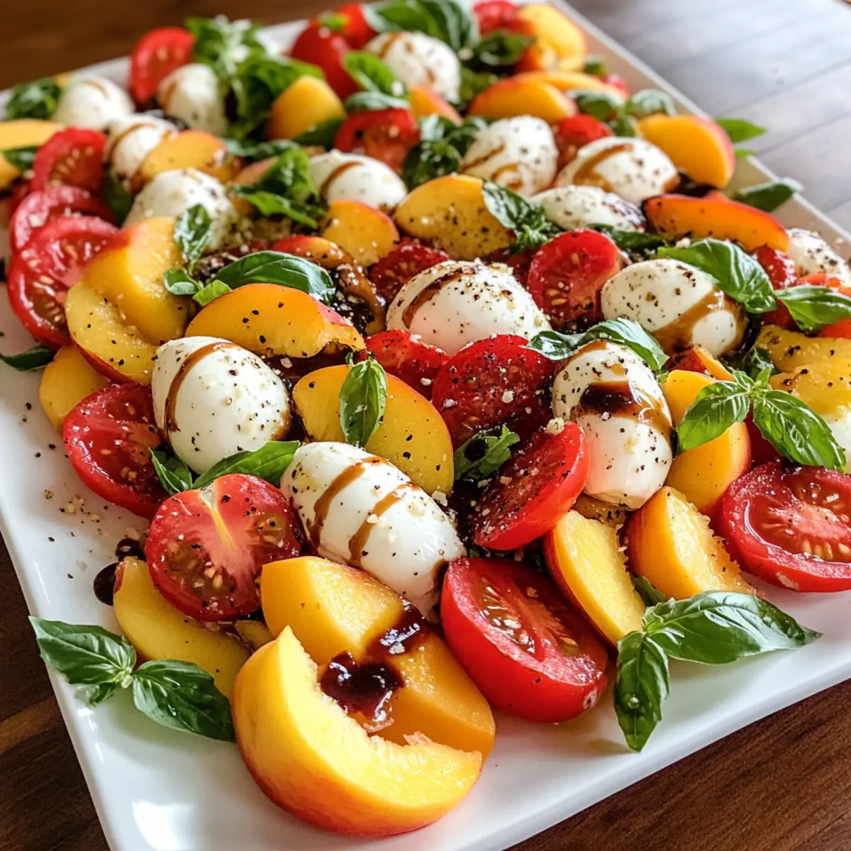 Vibrant Colors: The mix of fresh peaches, heirloom tomatoes, and aromatic basil creates a feast for the eyes, making it perfect for gatherings.
