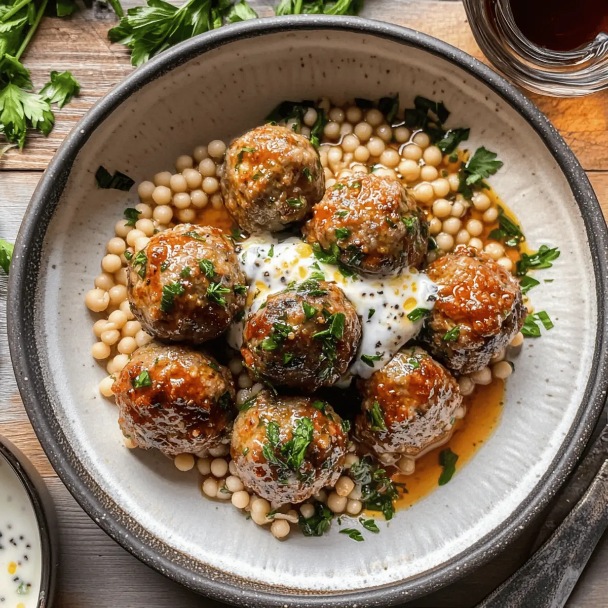 - Serve meatballs over fregola, drizzled with the yogurt sauce and additional olive oil.