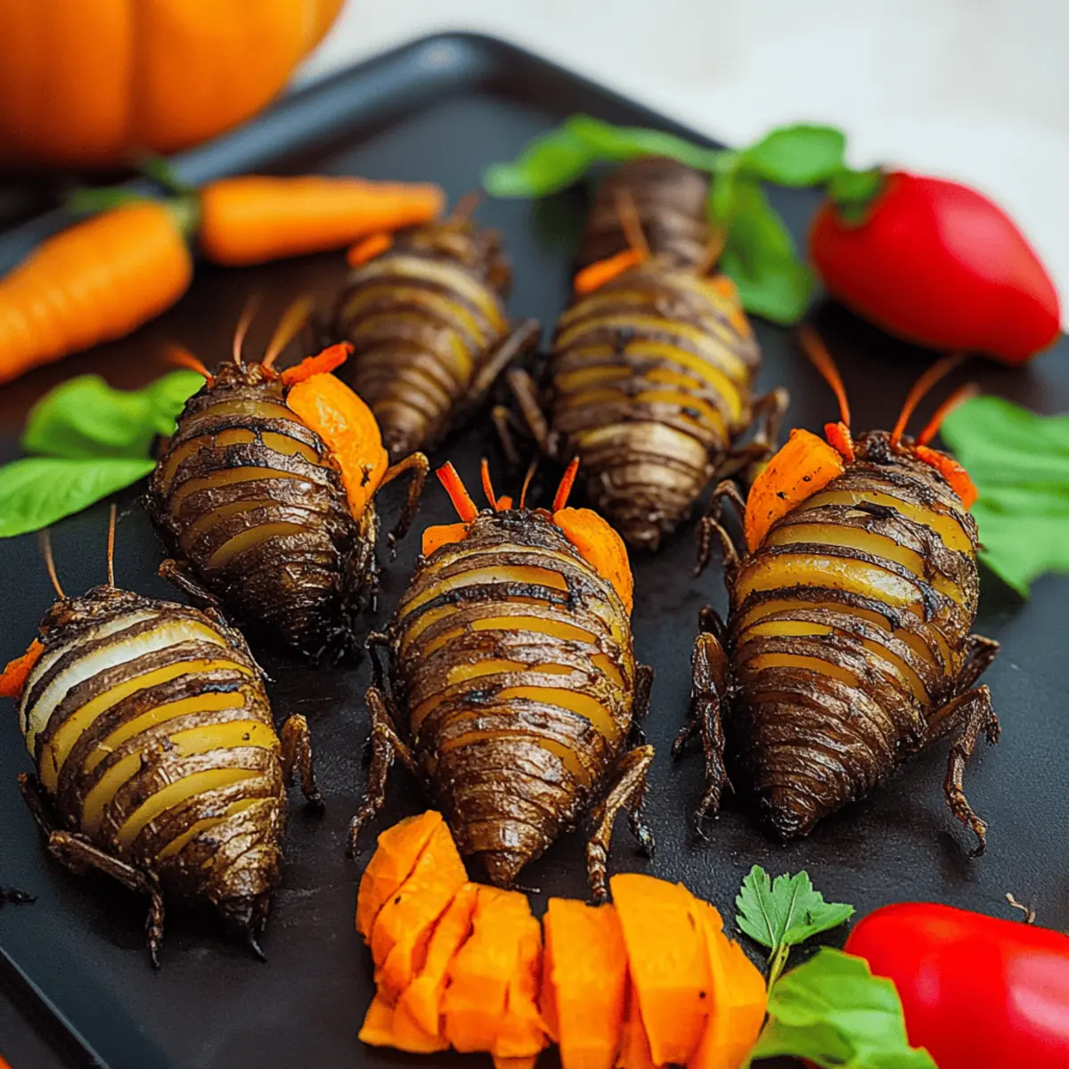 Once your creepy Hasselback Potato Bugs are golden and crisp, remove them from the oven and let them cool slightly before serving. Arrange the potatoes on a platter alongside mini bell peppers and carrot peels to enhance the festive look. These delightful creations are best enjoyed fresh, bringing smiles and spooky fun to your Halloween gatherings!