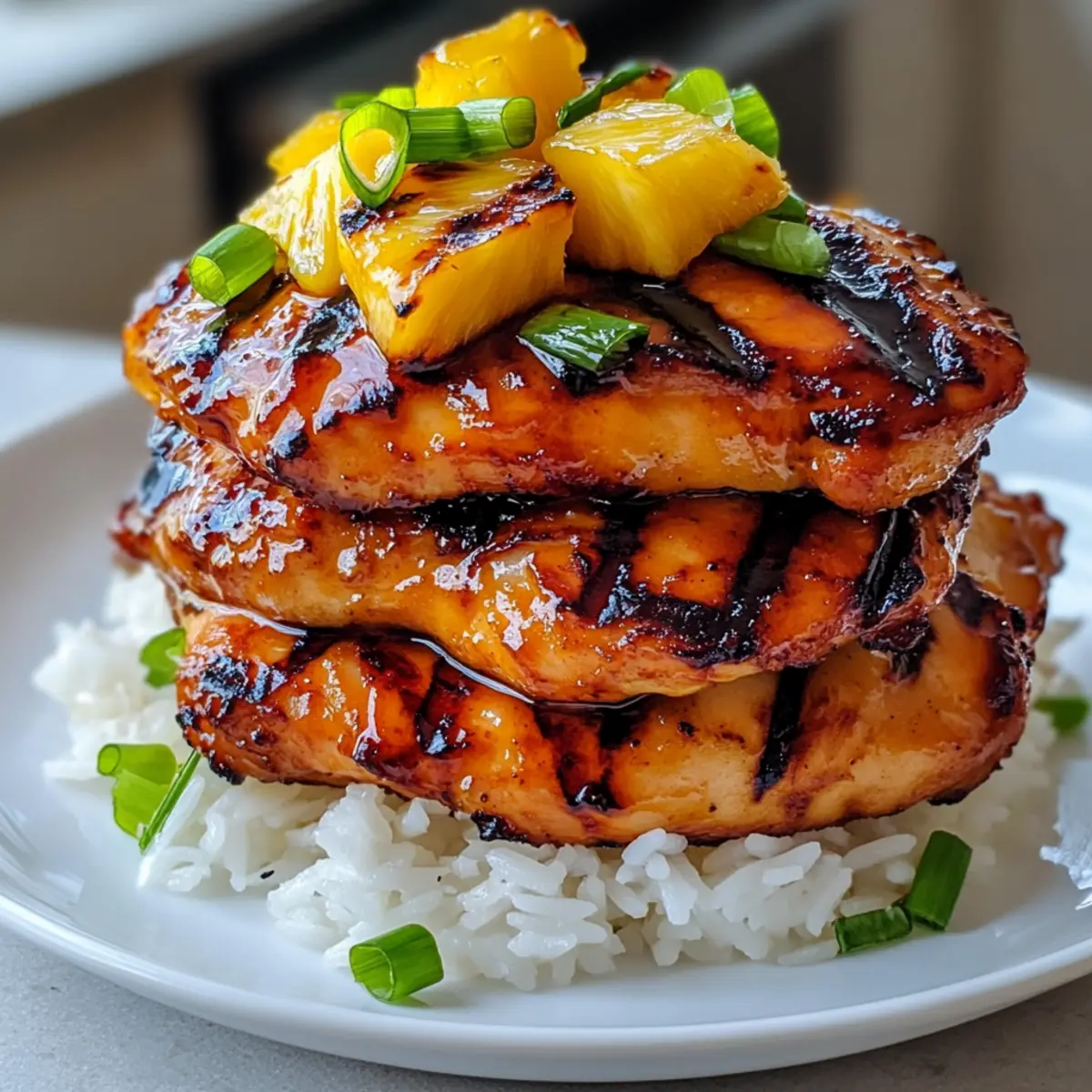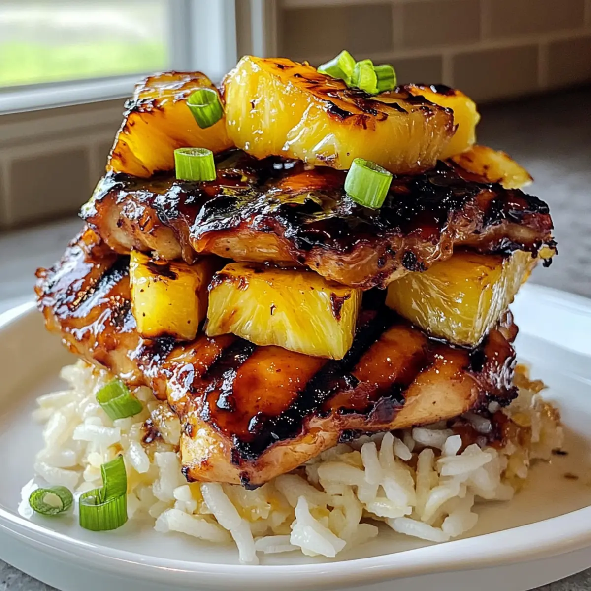 - Plate with rice, layer grilled chicken, drizzle glaze, add pineapple, and garnish with sesame seeds and green onions/cilantro.