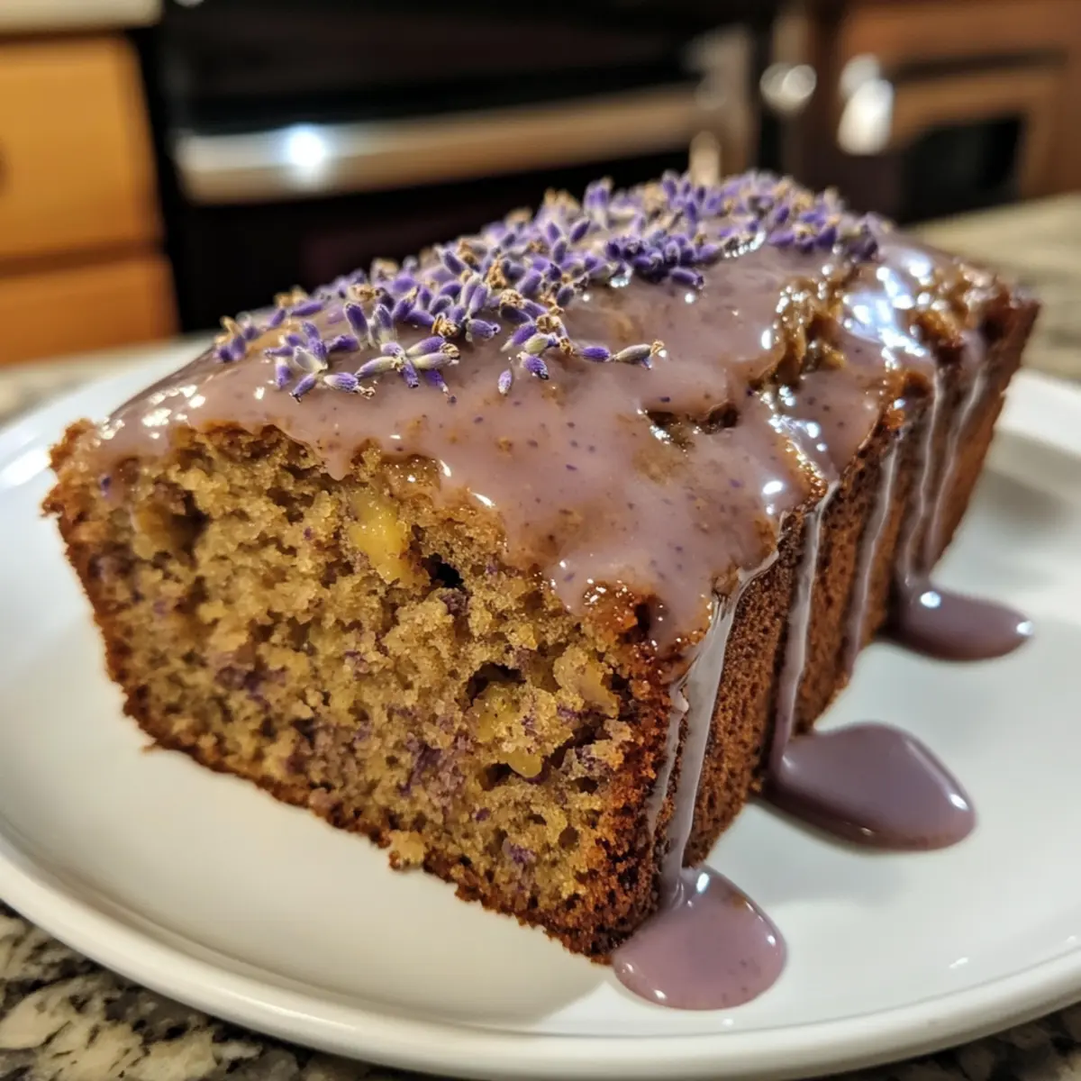- Drizzle the glaze over the cooled bread and garnish with lavender flowers if desired.