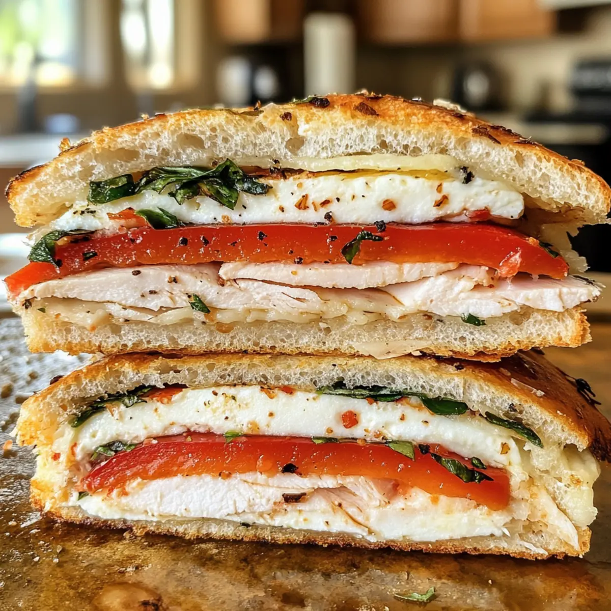 Drizzle balsamic glaze over the stacked ingredients to impart a sweet tang that beautifully complements the flavors of your Italian Turkey Focaccia Sandwich. Sprinkle fresh basil leaves and a handful of arugula atop the mozzarella to introduce freshness and an inviting crunch. These elements not only elevate the flavor but also enhance the visual appeal of your sandwich.