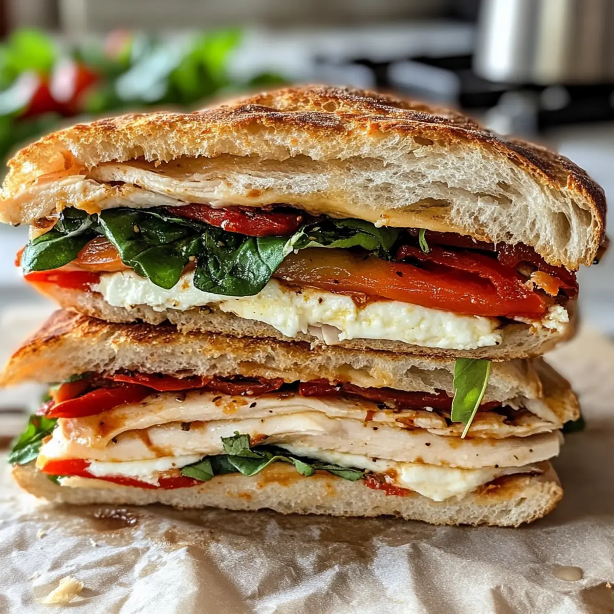 Start layering your deli turkey over the sun-dried tomato spread, followed by the prosciutto. Next, add the roasted red peppers, which will bring a sweet contrast to the savory layers. Finish with slices of fresh mozzarella, arranging them evenly for a balanced bite in every mouthful. Each filled layer adds texture and flavor, making this sandwich a delightful feast.