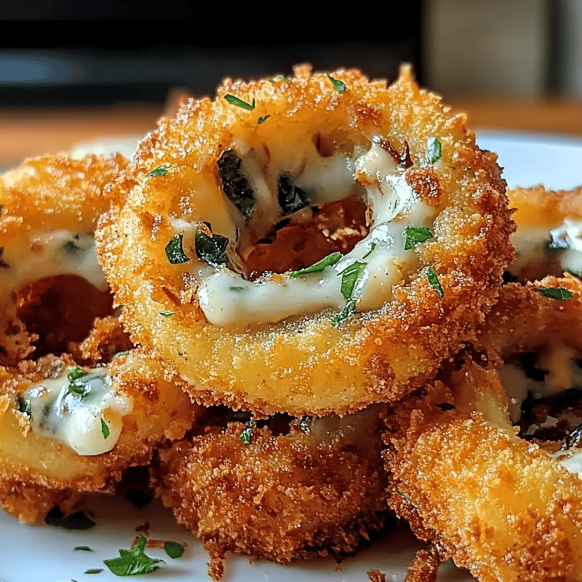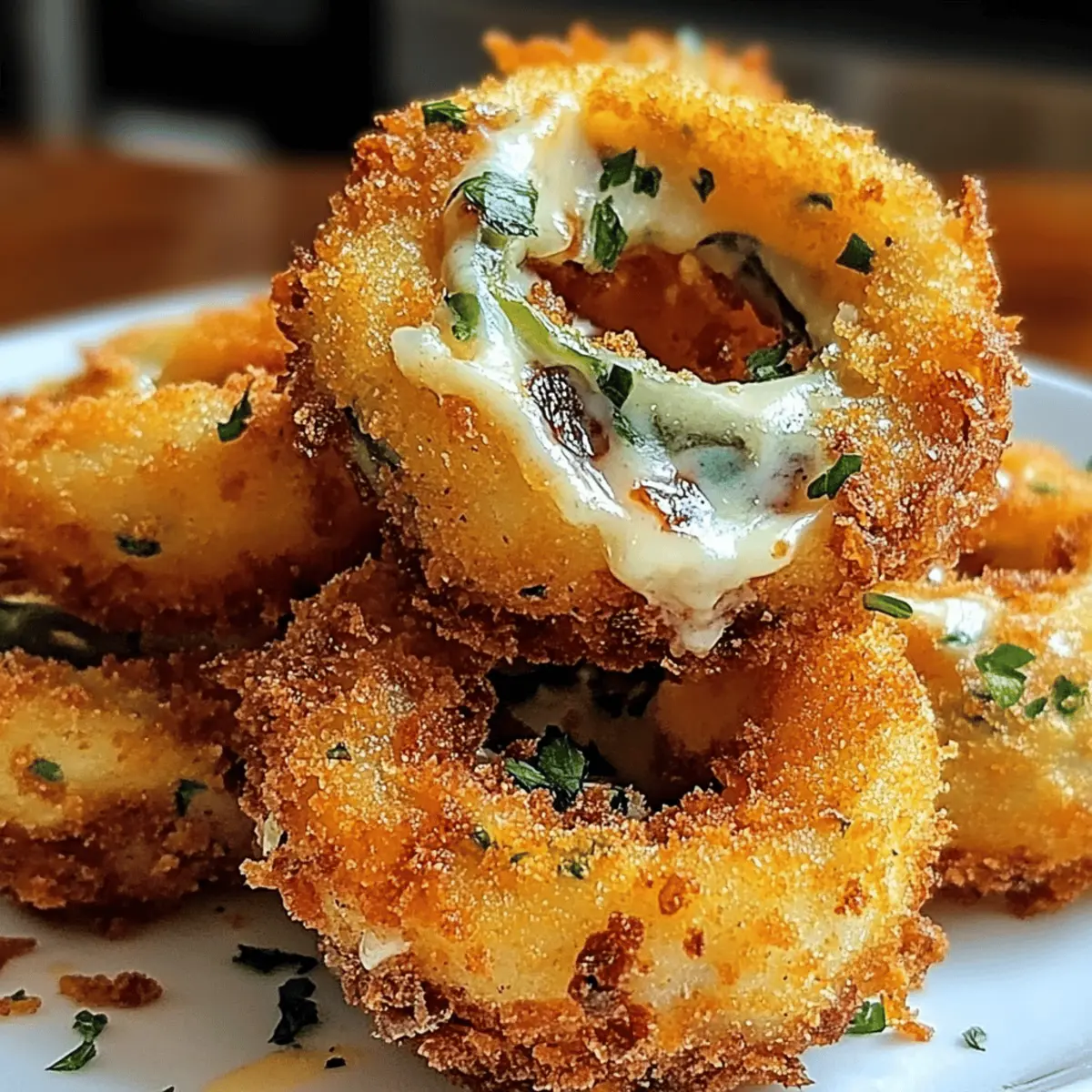 Crispy Perfection: Enjoy a satisfying crunch with every bite, making these Jalapeño Popper Stuffed Onion Rings an instant crowd-pleaser.