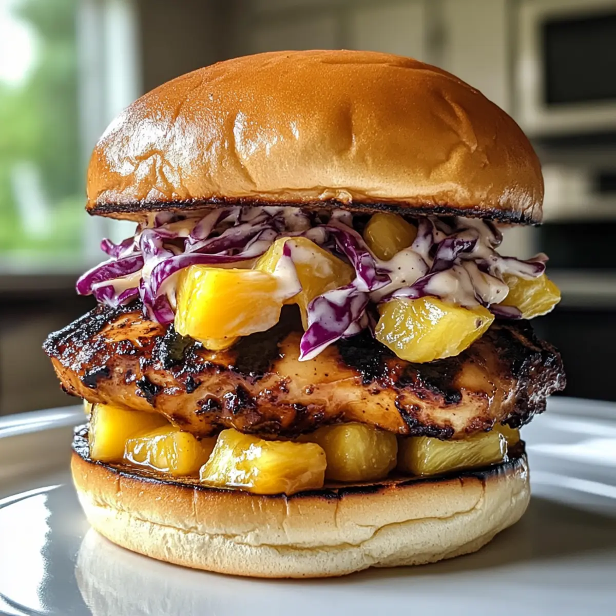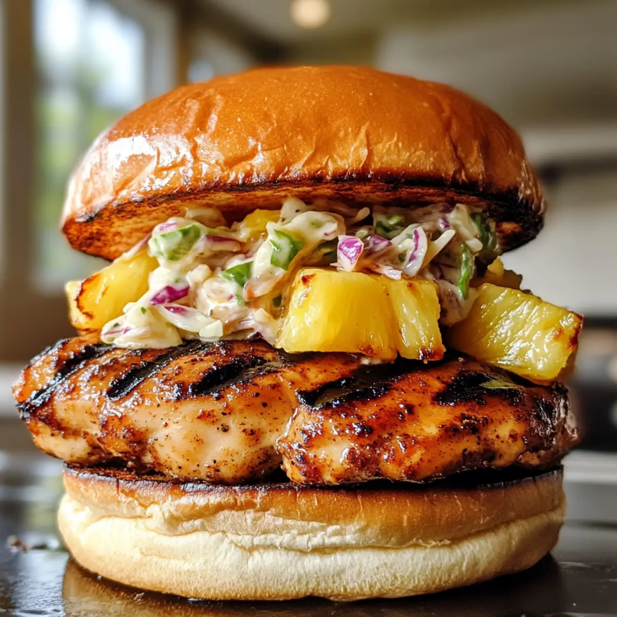 - Assemble the sandwiches by layering grilled chicken, grilled pineapple, and coleslaw on each burger bun.