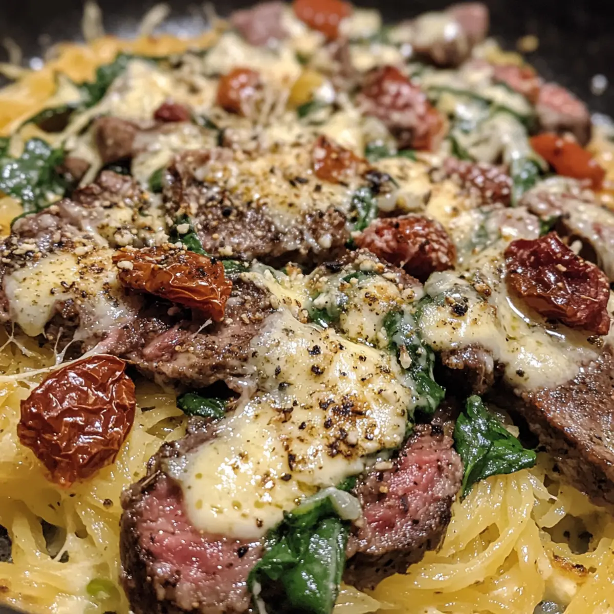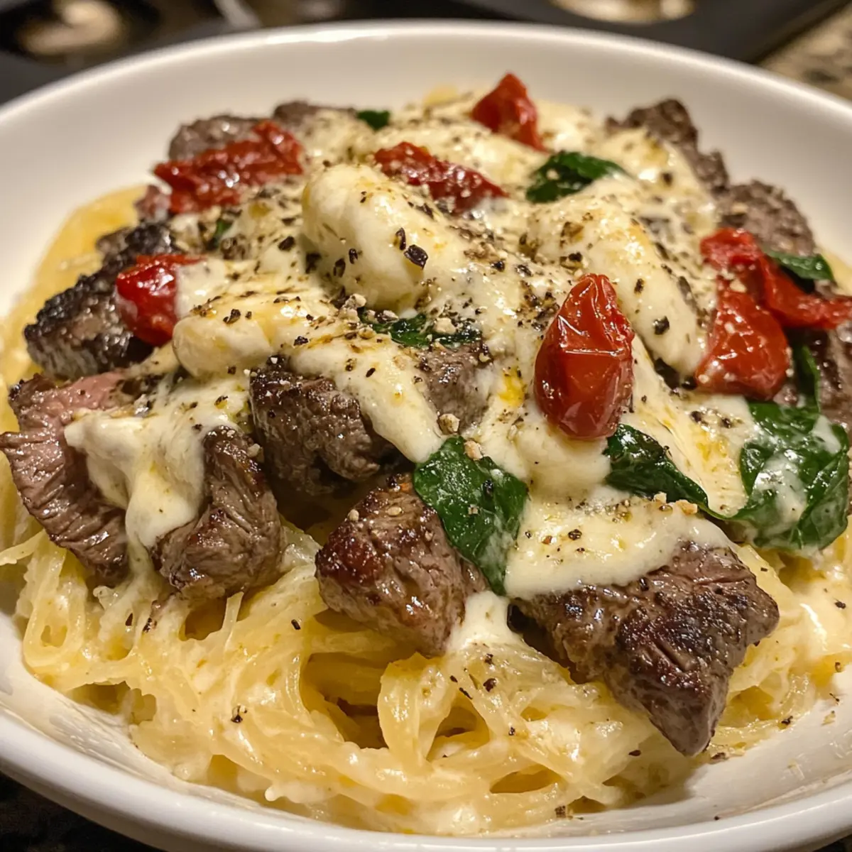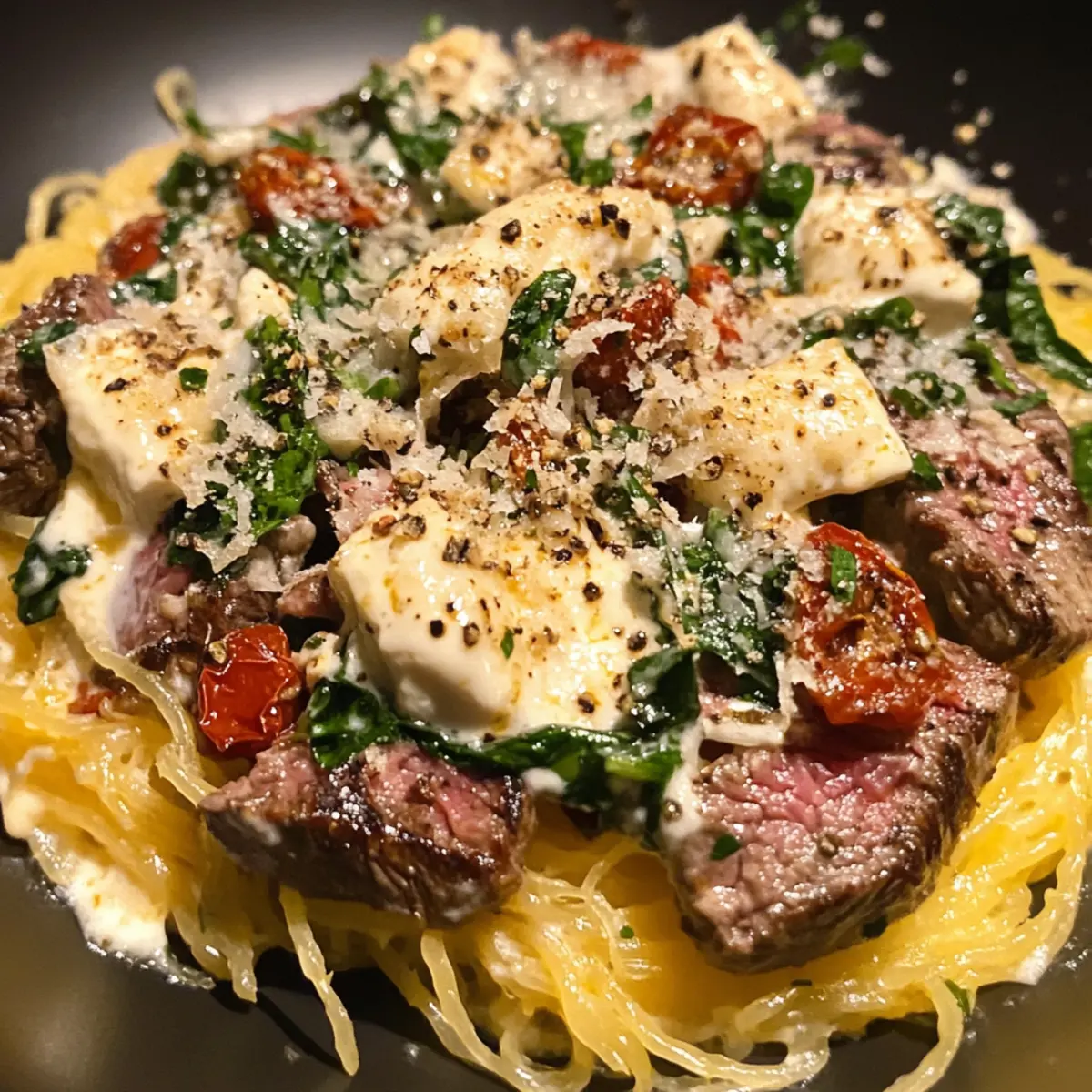 Keto Low Carb Steak Gorgonzola Alfredo Spaghetti Squash Delight