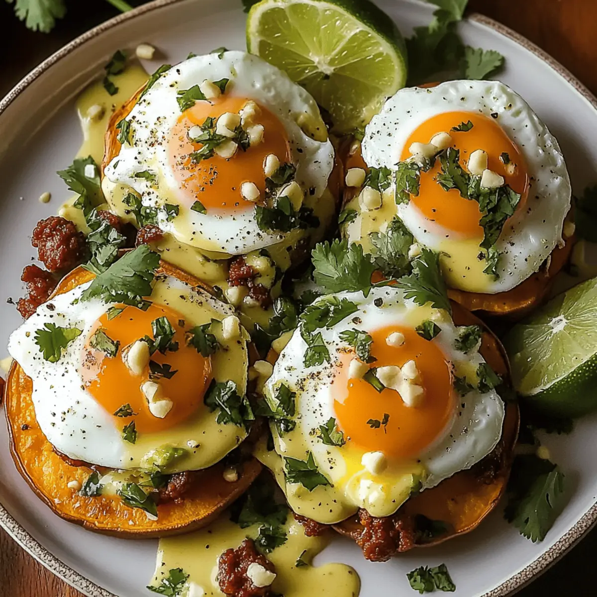 This Mexican Eggs Benedict redefines brunch, combining roasted sweet potatoes, chorizo, and a smoky chipotle hollandaise for a deliciously healthy twist.