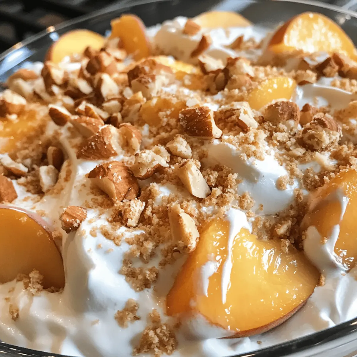 Sprinkle the graham cracker mixture evenly over the top of the salad to add a satisfying crunch. If desired, finish with a garnish of fresh mint leaves for a pop of color and a hint of freshness. This beautiful contrast elevates your Millionaire Peach Salad, making it not only delicious but also visually stunning.