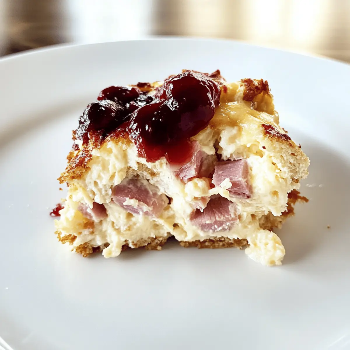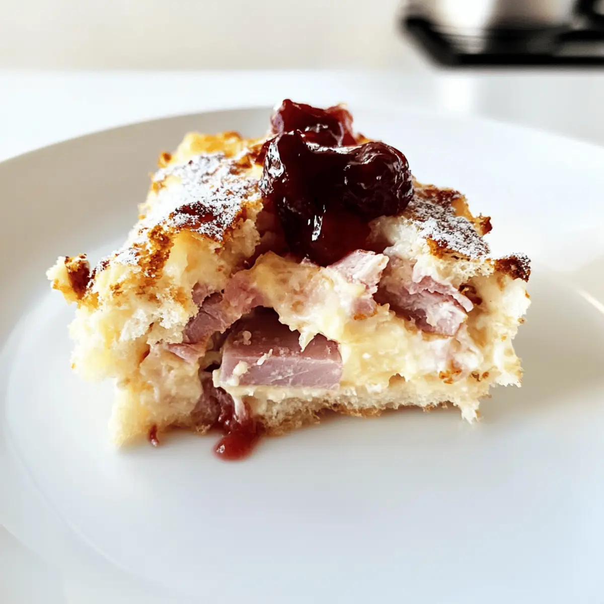 After baking, remove your Monte Cristo Breakfast Casserole from the oven and let it cool slightly. Drizzle raspberry preserves on top for a sweet finish that contrasts wonderfully with the savory flavors. Allow it to sit for a minute before slicing and serving, making this comforting dish even more inviting.