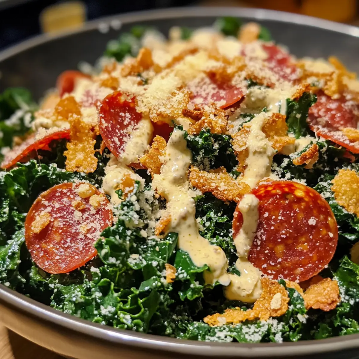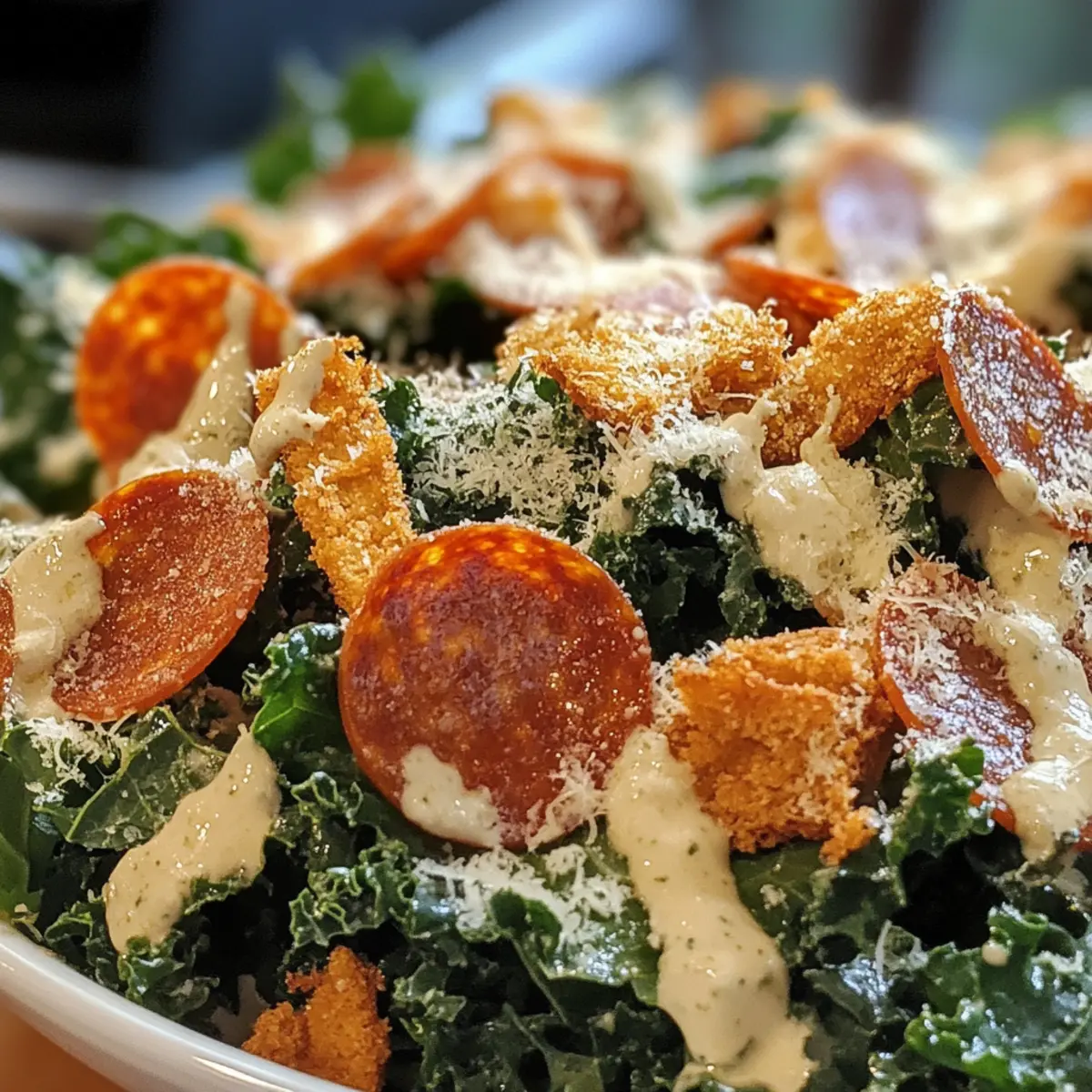 Dress with Care: When tossing the kale, use just enough dressing to coat without overwhelming. Taste and adjust as you mix to ensure balanced flavors in your Pizza Caesar Salad.
