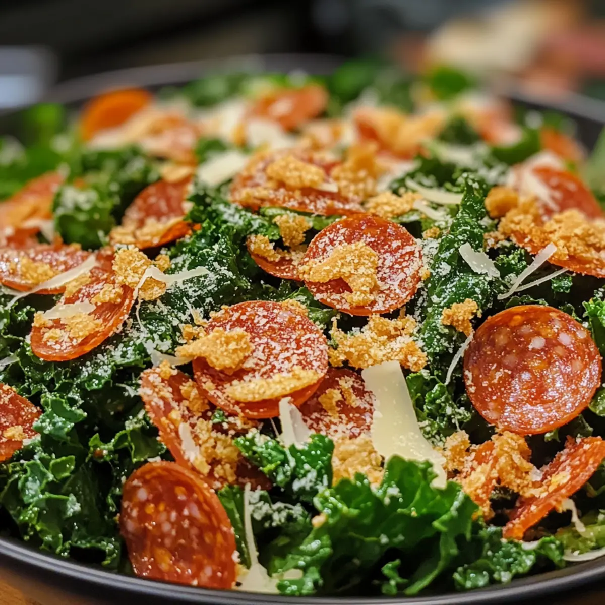 - Combine the crispy pepperoni with the toasted breadcrumbs. Pile the mixture on top of the dressed kale and add Parmesan cheese.