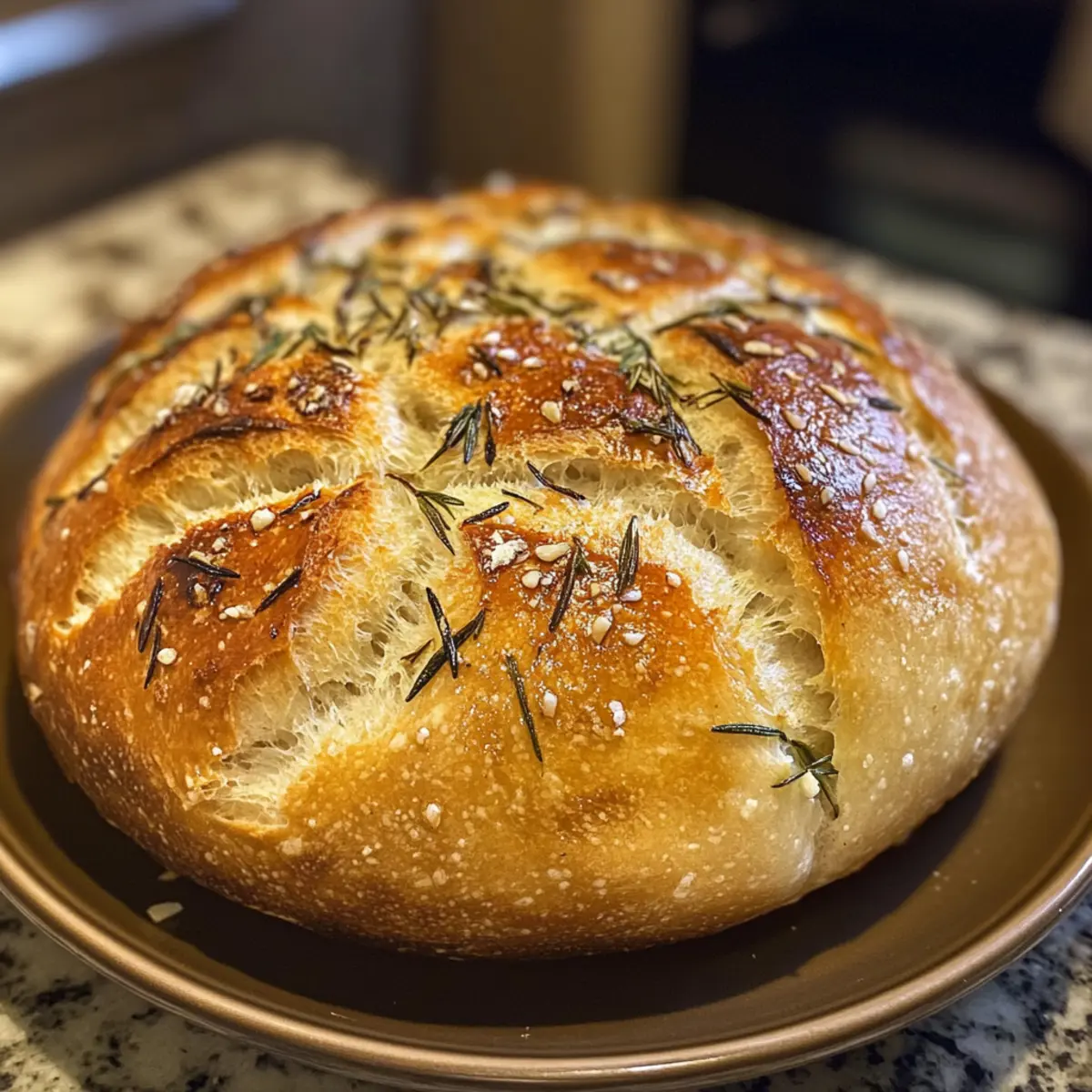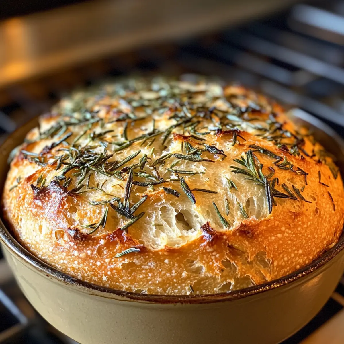 Once preheated, carefully transfer your loaf into the oven. Bake for 30-35 minutes, until the bread is golden brown and sounds hollow when tapped on the bottom. Keep an eye on the crust; it should be crispy and beautifully colored. The enticing aroma of roasted garlic and rosemary will fill your kitchen as it bakes!