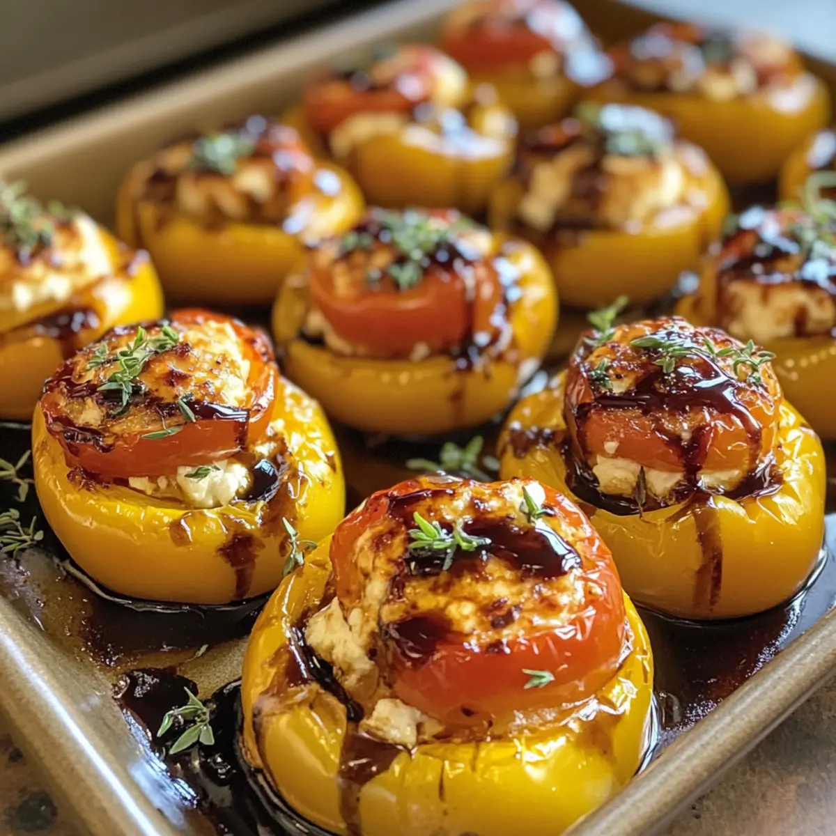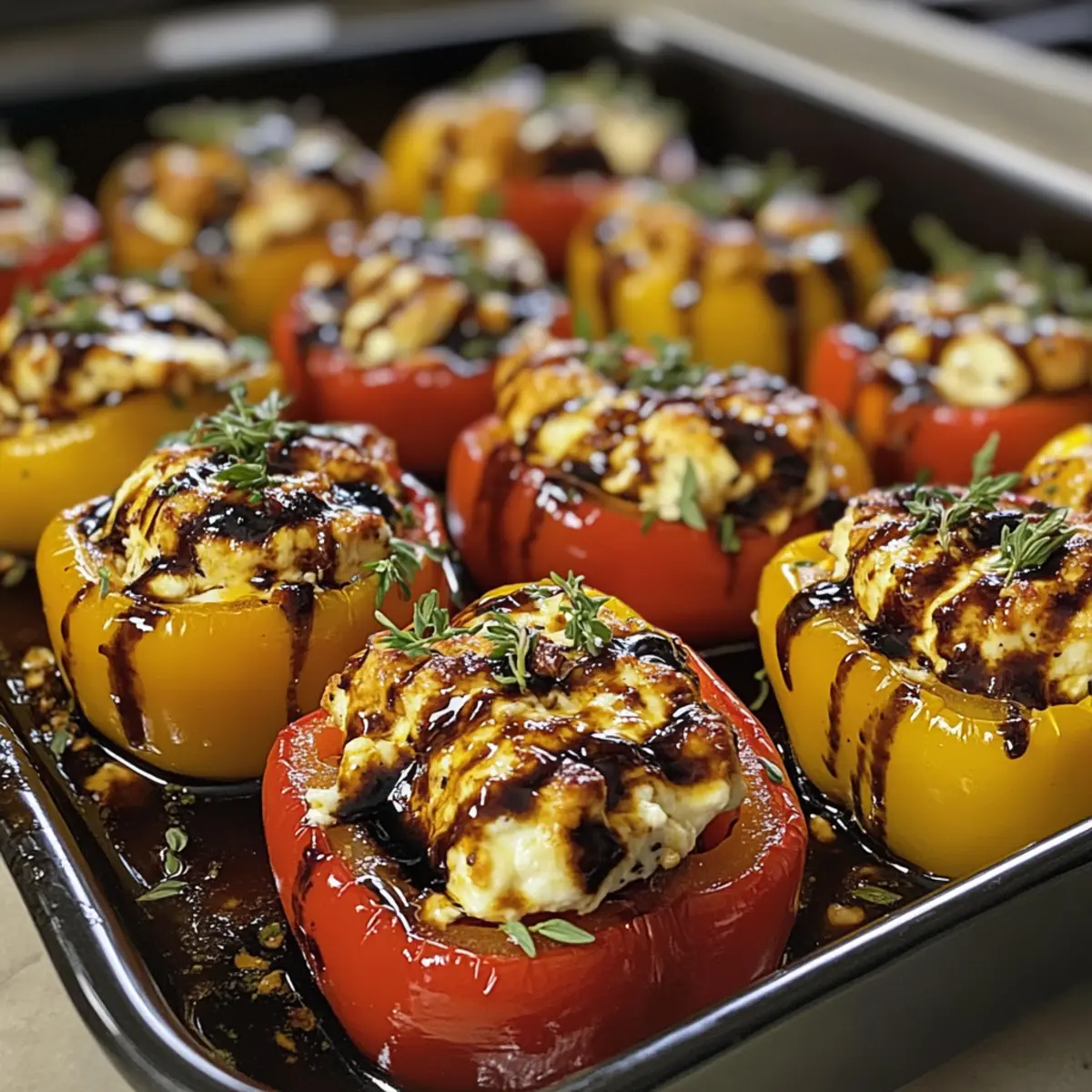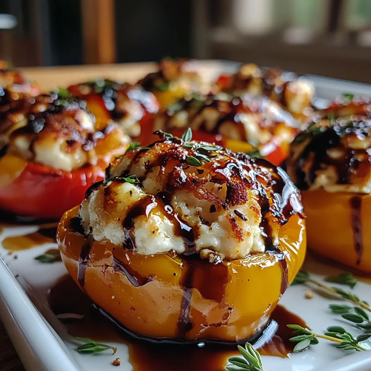 Once the roasted goat cheese stuffed mini peppers are out of the oven, let them cool for a minute. Drizzle them generously with balsamic glaze and honey, which beautifully contrasts the tangy filling. Finish with a sprinkle of fresh thyme and black pepper for an aromatic kick that complements the flavors perfectly before serving warm.