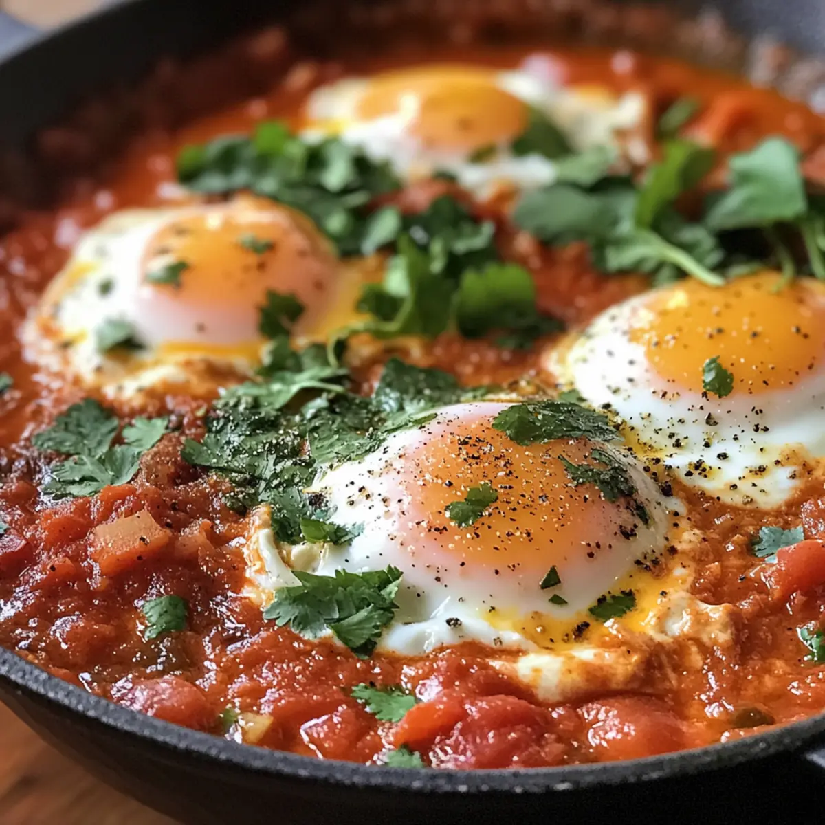 Once your sauce is ready, create small wells in the tomato mixture and gently crack in 4 large eggs, ensuring they nestle within the sauce. Reduce the heat to low, cover the pan, and cook for 5-8 minutes. Keep an eye on the eggs until the whites are set but the yolks remain runny, or cook longer for firmer yolks.
