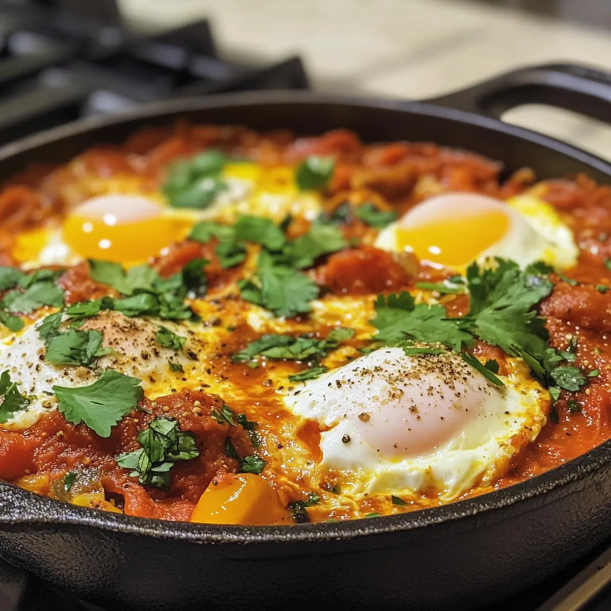 - Create small wells in the sauce and crack in the eggs. Cover and cook for 5-8 minutes until whites are set but yolks are runny.