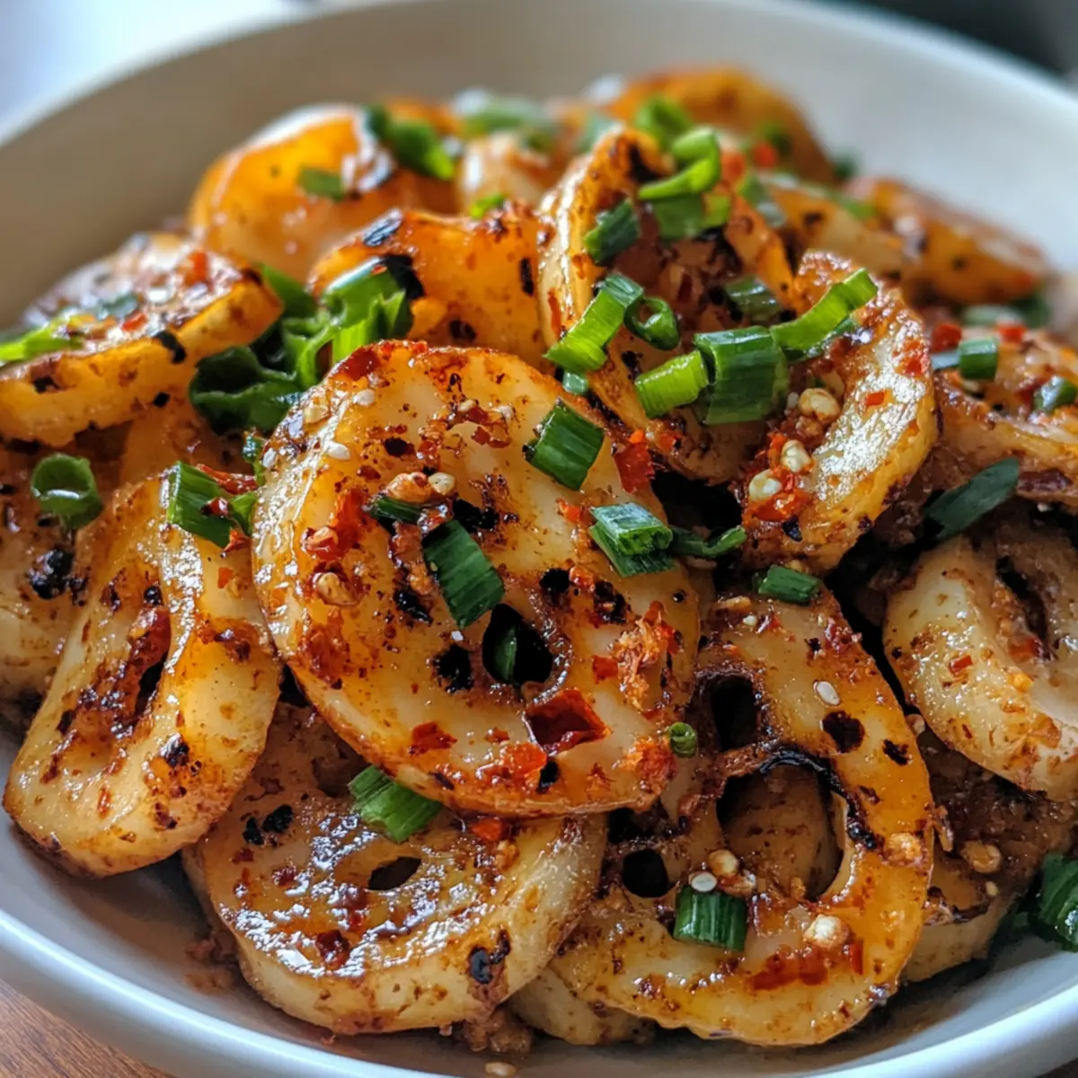 Once thickened and aromatic, take off the heat and transfer your vibrant herb-infused Spicy Lotus Root Stir Fry to a serving dish. Garnish generously with the green parts of chopped green onions and sprinkle with additional red pepper flakes if desired. Serve warm to enjoy the full burst of flavors!