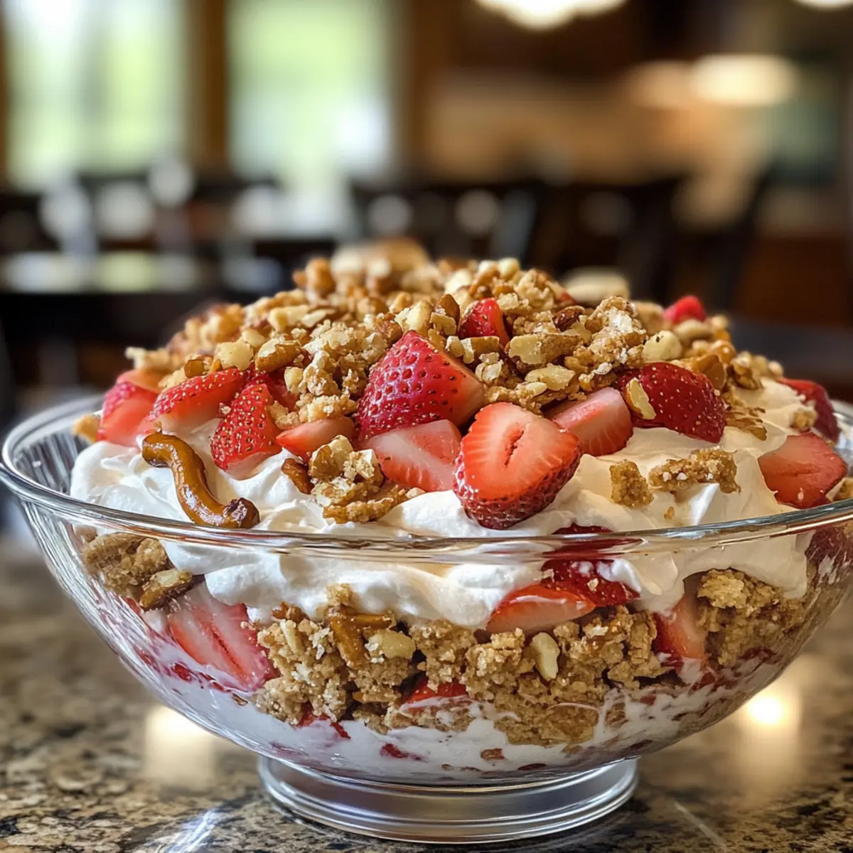 - Layer the chilled cream mixture in a large serving dish, add sliced strawberries on top, and sprinkle with the pretzel mixture.