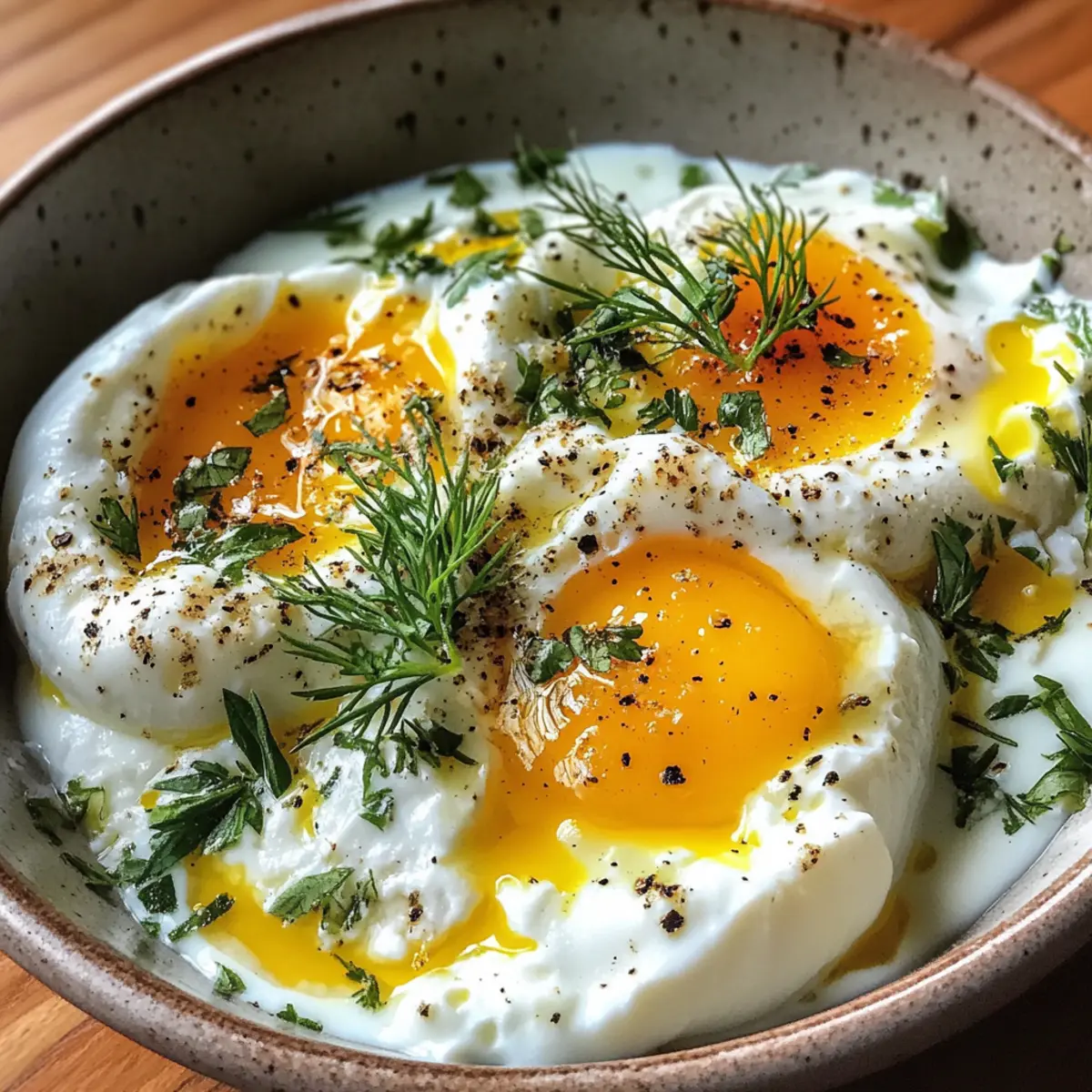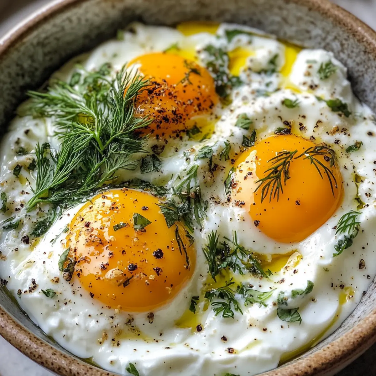 To serve, take a generously heaped spoonful of the herbed yogurt and spread it across the bottom of a shallow bowl. Gently place 2 poached eggs on top of the yogurt, allowing the creamy yolks to slightly blend with the yogurt underneath. Drizzle the prepared butter sauce over the eggs, and garnish with extra fresh dill and a sprinkle of flaky sea salt for that final touch. Enjoy this delightful Turkish Eggs with Creamy Yogurt & Butter Sauce with warm crusty bread for the perfect meal experience.